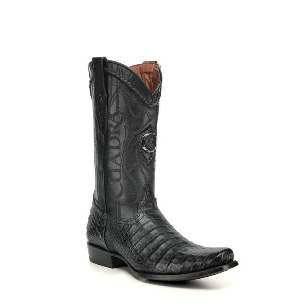 Bota vaquera Orígenes para caballero en piel genuina de fuscus y bovino. Presenta herraje metálico del monograma de la marca sobre piel genuina de fuscus, bordado en alto relieve, tejido artesanal y grabado láser en motivos orgánicos. Cuenta con el logotipo Cuadra en el costado y en la parte trasera, la leyenda “Cuadra Tradicional”. Con piel genuina de fuscus en las orejas. Suela de cuero con injerto de TPU antiderrapante.