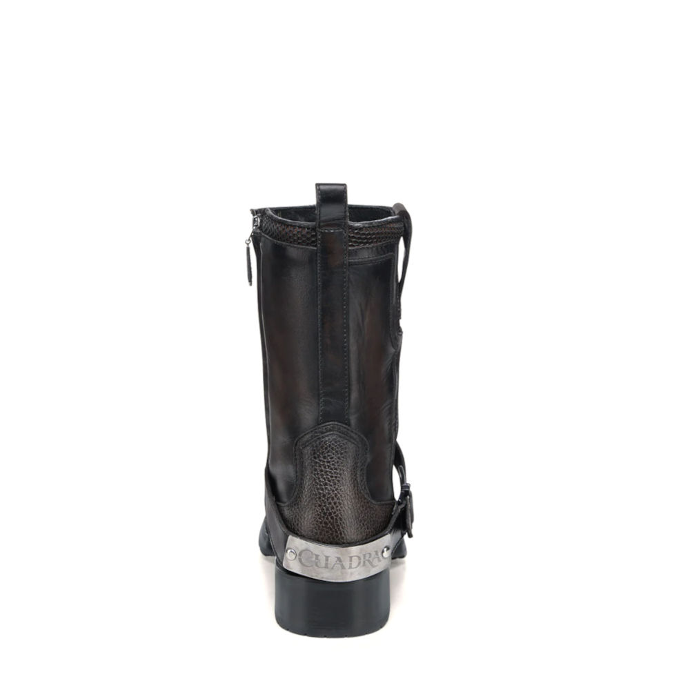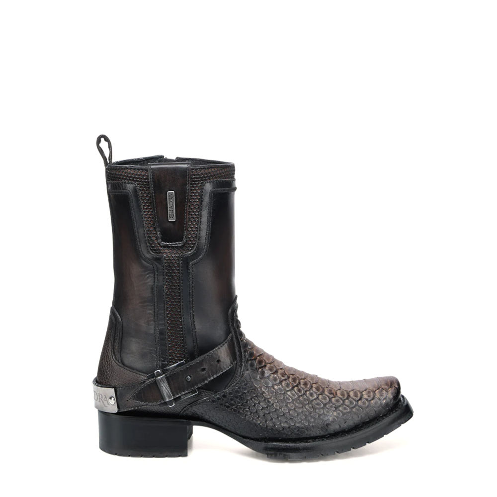Bota biker en piel genuina de pitón y piel de bovino para caballero. Presenta correa decorativa alrededor del tobillo con hebilla y aplicación metálica con grabado Cuadra, aplicaciones de KPU en motivos geométricos al costado y borde superior, sombreado a mano y una aplicación metálica del logotipo Cuadra en oreja. Ajustado con cierre interno. Cuenta con las nuevas tecnologías: plantilla flex removible, planta Ortholite, que le dan mayor ligereza, confort, transpirabilidad y amortiguación. Suela track antiderrapante