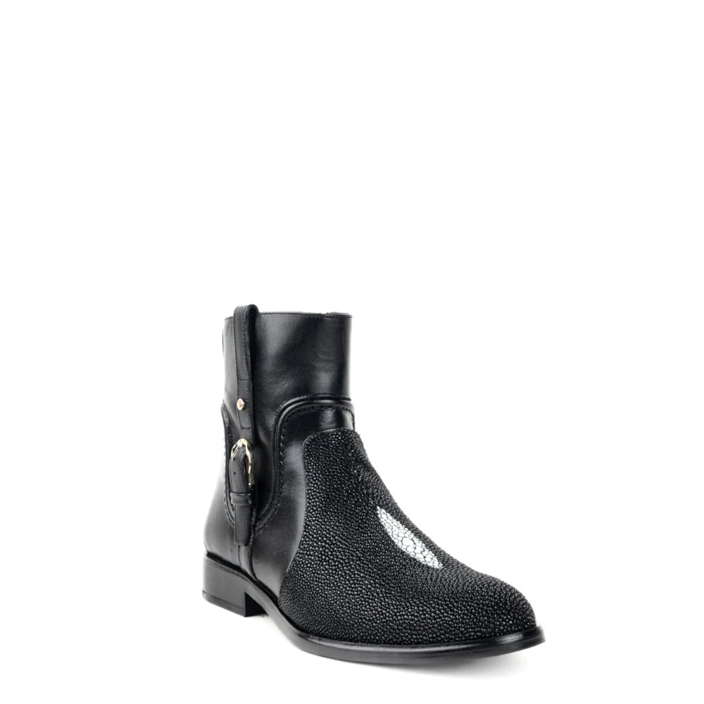 Botín de vestir para dama en piel genuina de mantarraya y piel de bovino. Cuenta con una correa decorativa con hebilla y pequeña aplicación metálica al costado. Ajuste por medio de cierre interno. Suela de cuero con TPU.