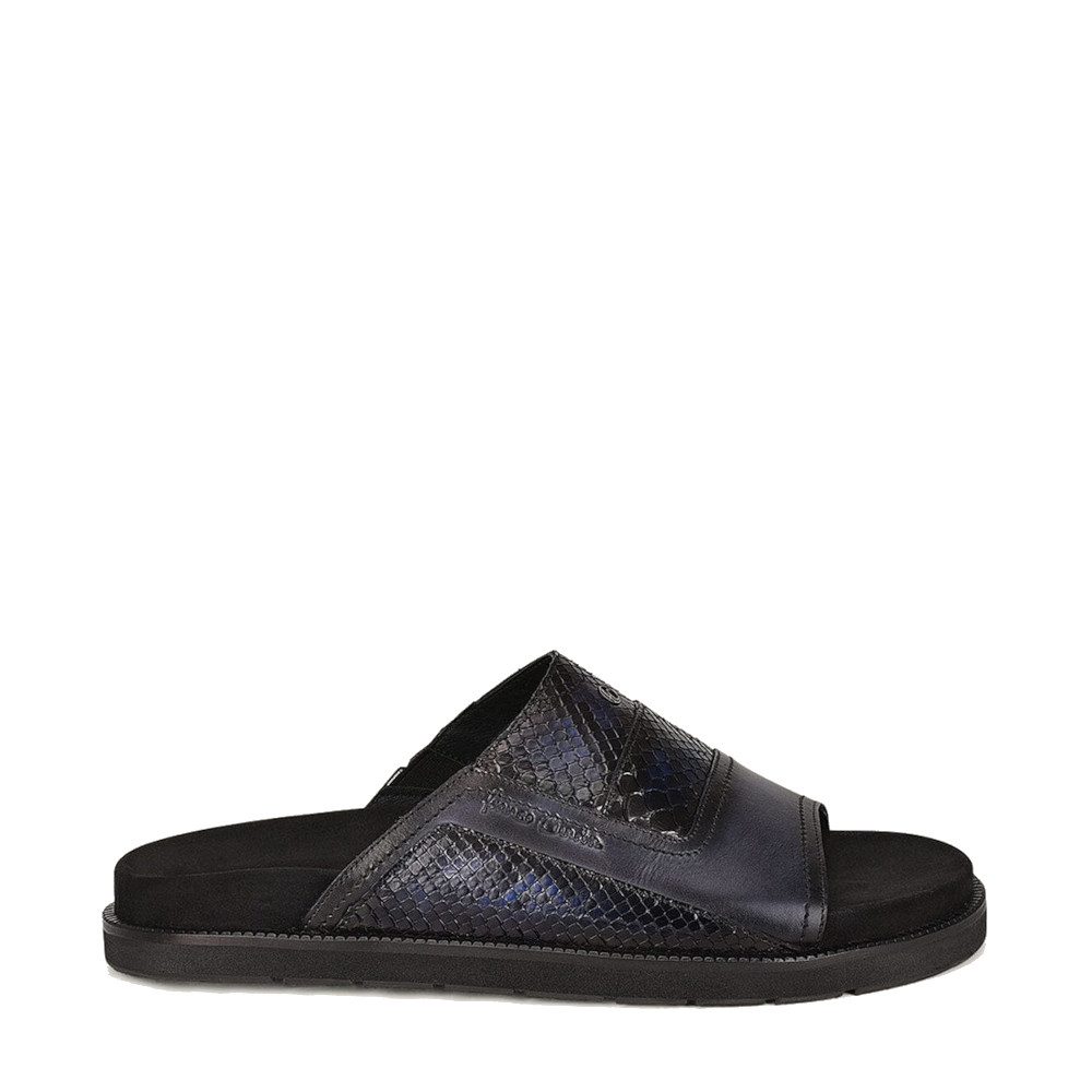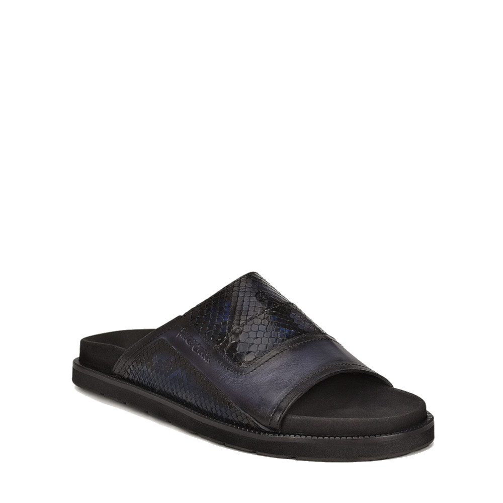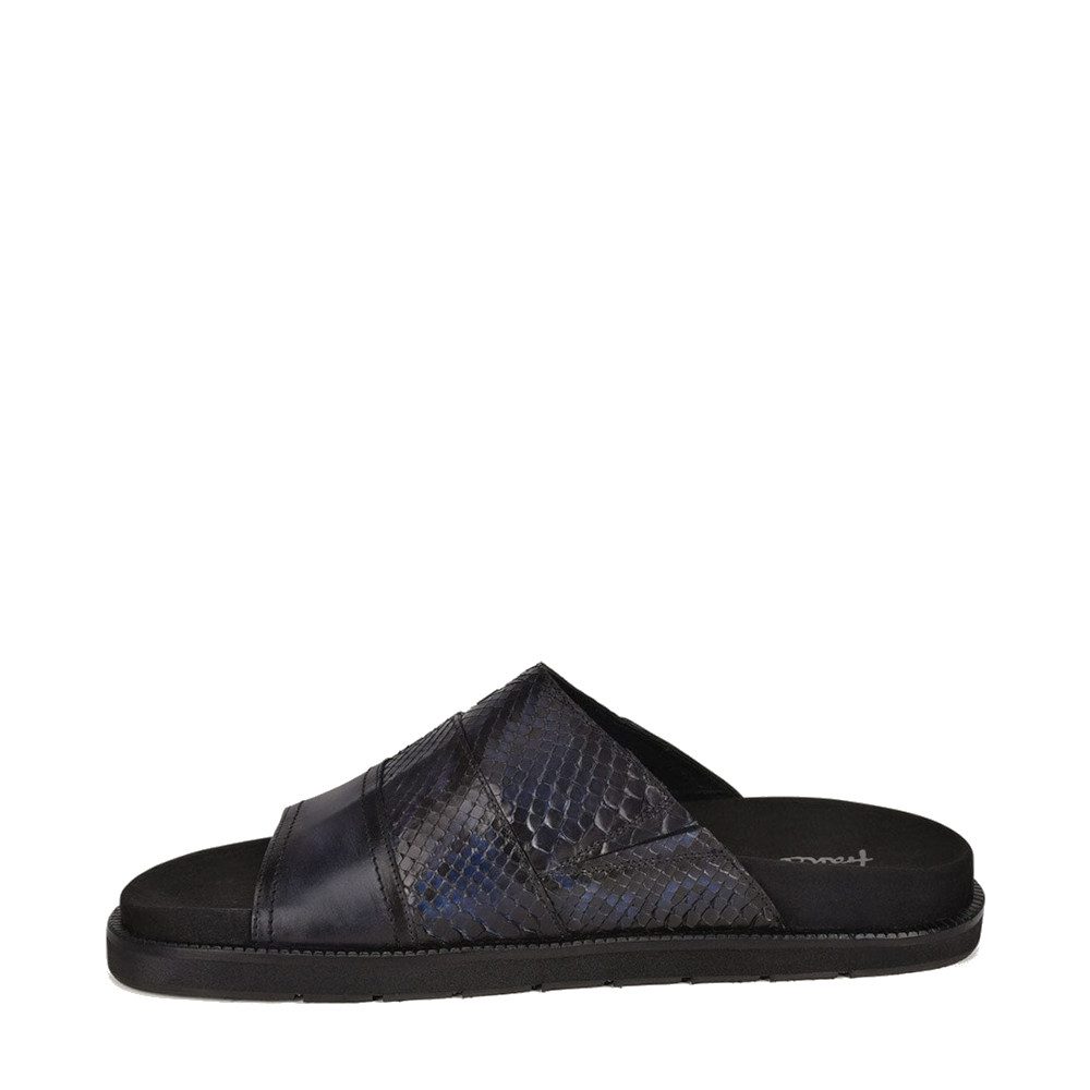 Sandalia para caballero en piel genuina de pitón y piel de bovino. Presenta aplicación metálica de monograma Franco Cuadra al frente y sombreado pintado a mano. Con footbed ultrasuave forrado en textil antimicótico y transpirable. Con suela de EVA y hule.