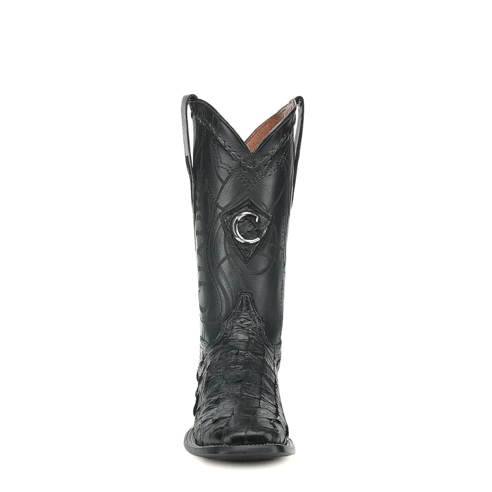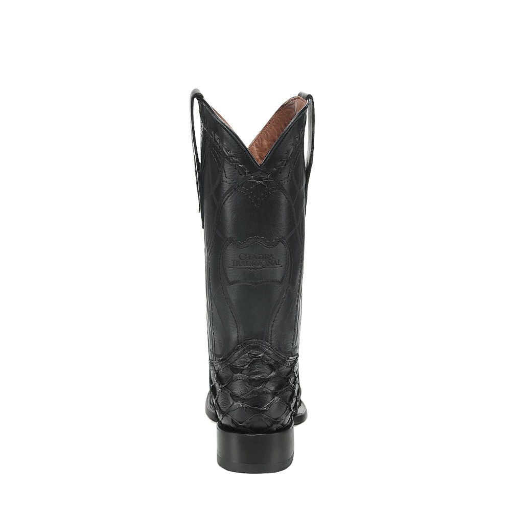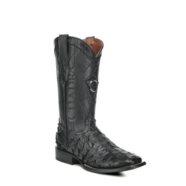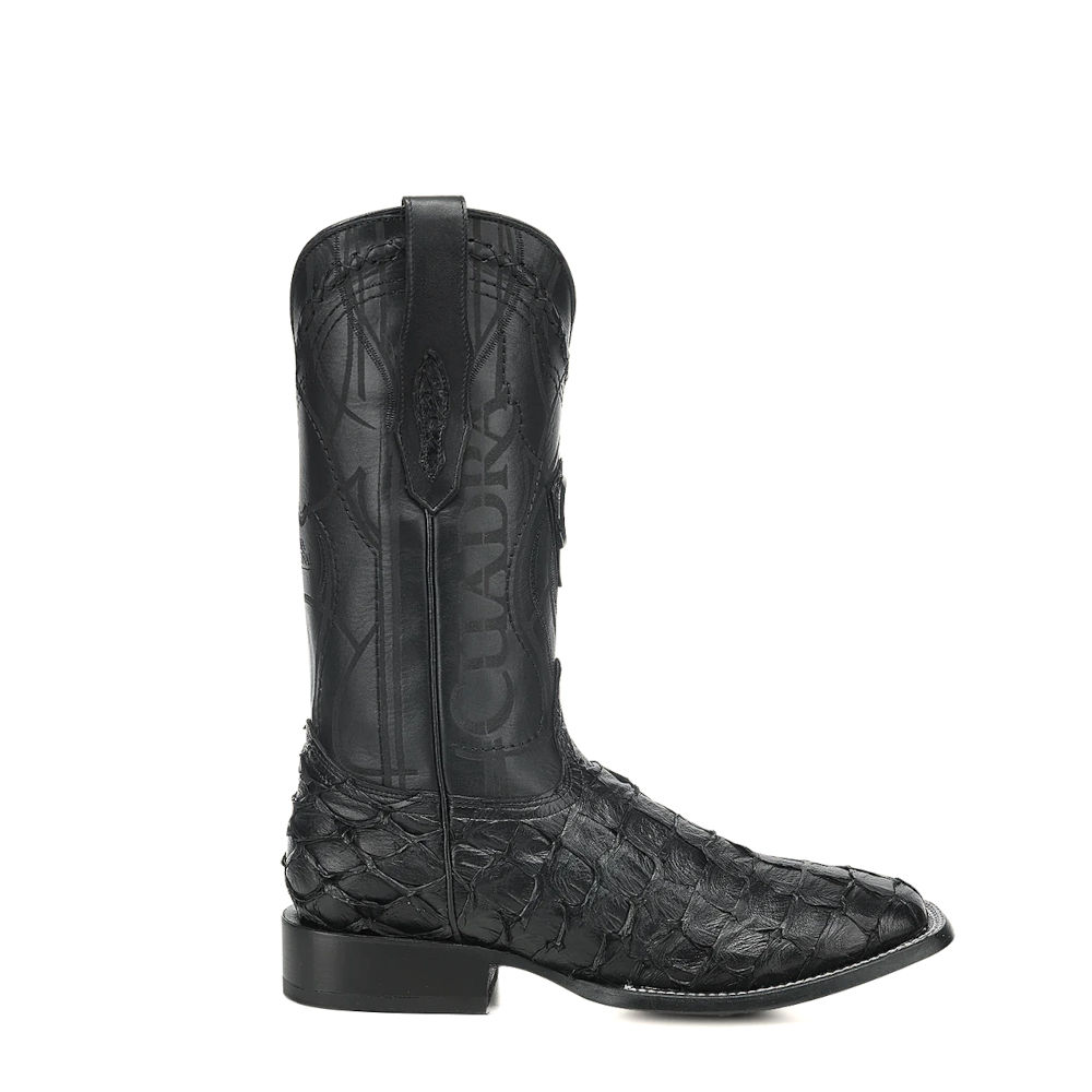 Bota vaquera Orígenes para caballero en piel genuina de pirarucu y bovino. Presenta herraje metálico del monograma de la marca sobre piel genuina de pirarucu, bordado en alto relieve, tejido artesanal y grabado láser en motivos orgánicos. Cuenta con el logotipo Cuadra en el costado y en la parte trasera, la leyenda “Cuadra Tradicional”. Con piel genuina de pirarucu en las orejas. Suela de cuero con injerto de TPU antiderrapante.