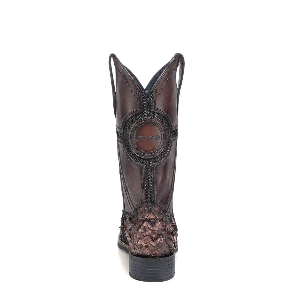Bota rodeo Orígenes en piel genuina de pirarucu y piel de bovino para caballero. Presenta aplicaciones de KPU en motivos geométricos, tejido a modo artesanal en alto relieve, aplicación metálica del monograma Cuadra sobre piel genuina de pirarucu, aplicación del logotipo de la marca en alto relieve en orejas y grabado láser del logotipo Cuadra en la parte trasera. Cuenta con las nuevas tecnologías: platilla flexrider, planta Ortholite y suela flexrider, que le dan mayor ligereza, confort, transpirabilidad y amortiguación. Tubo suave diseñado con entretelas.