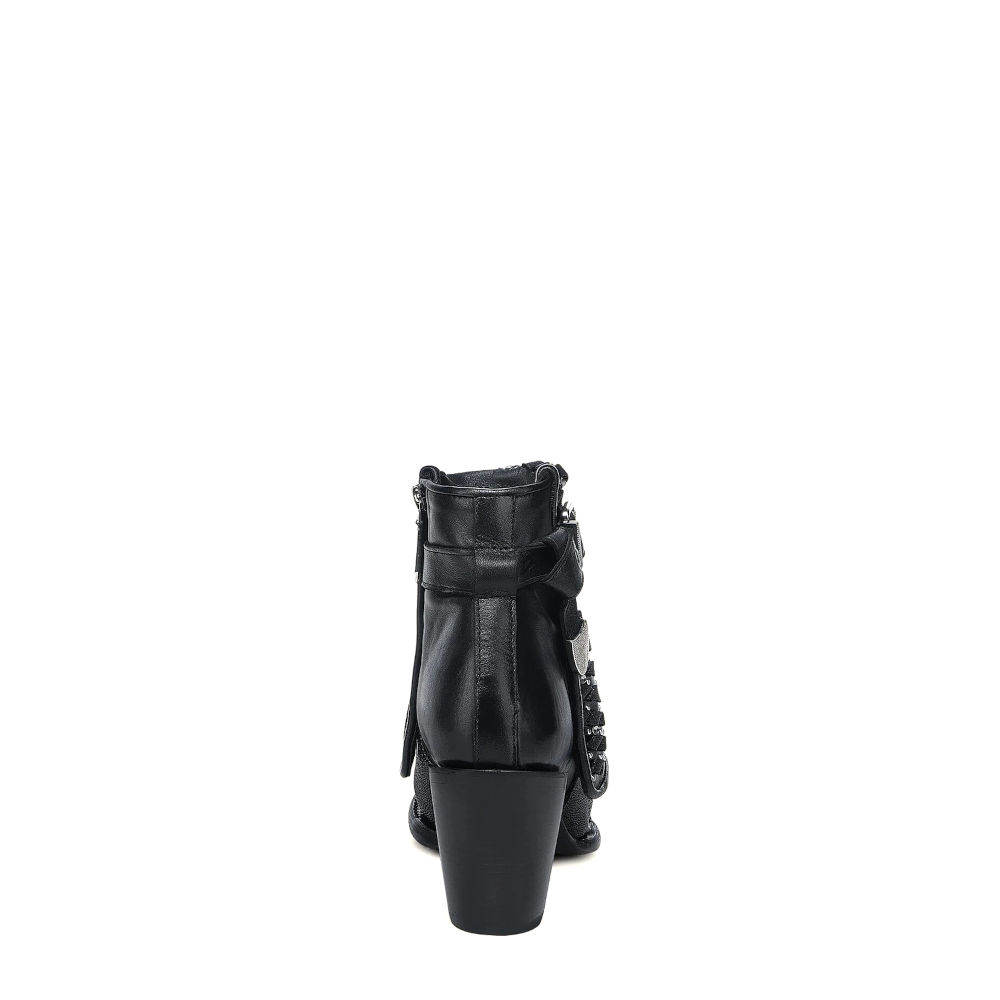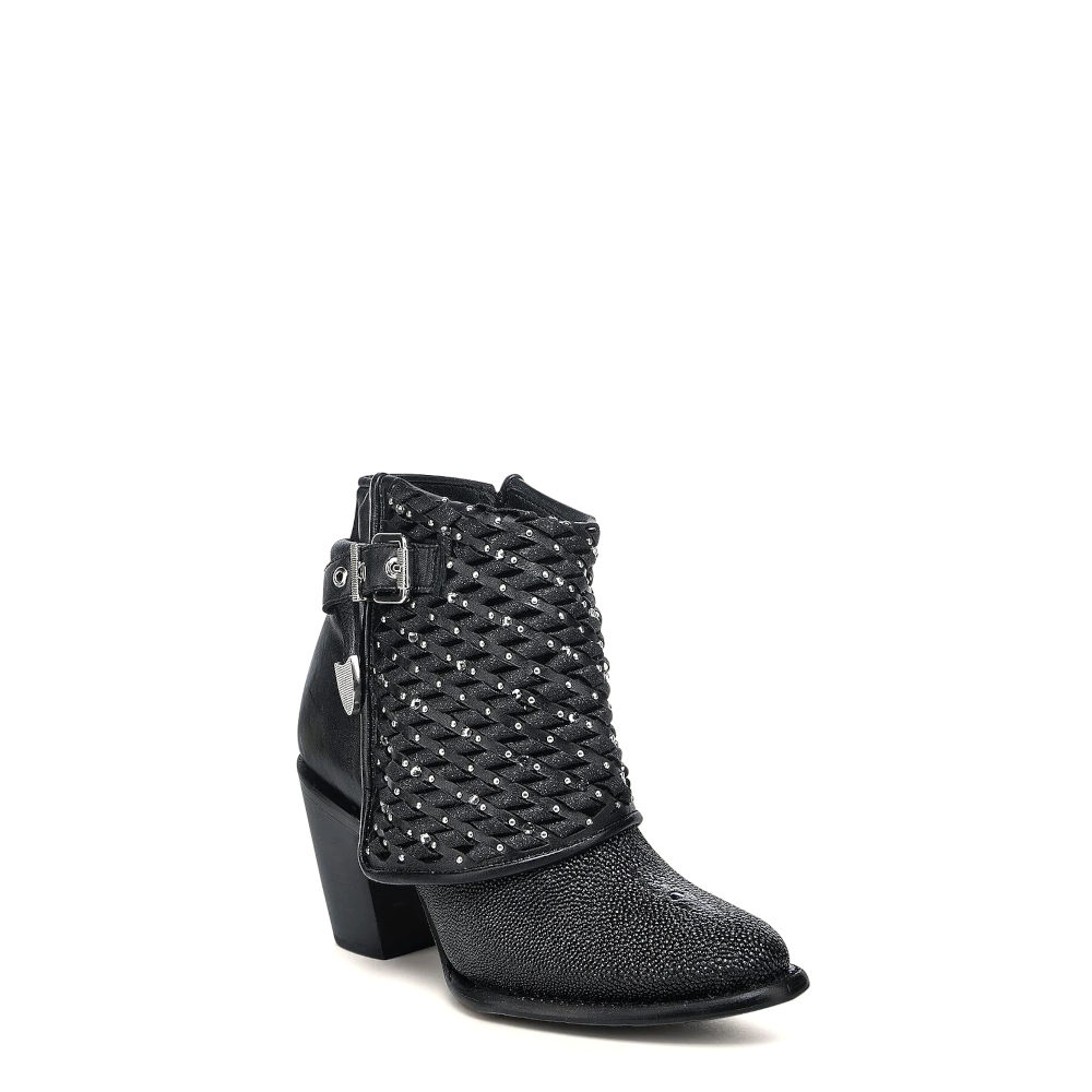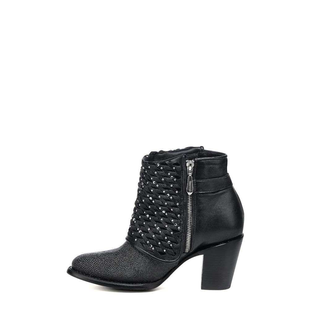 Botín para dama en piel genuina de mantarraya y piel de bovino. Presenta faldón con tejido artesanal de piel genuina y textil, aplicaciones metálicas y cristales auténticos Swarovski®. Con correa decorativa sujeta con hebilla en la parte lateral. Ajustado con cierre interno. Cuenta con las nuevas tecnologías: platilla flex removible, planta Ortholite, que le dan mayor ligereza, confort, transpirabilidad y amortiguación. Con suela de cuero con injerto de TPU.