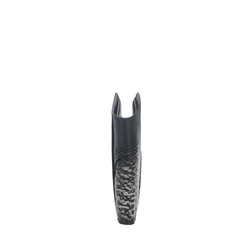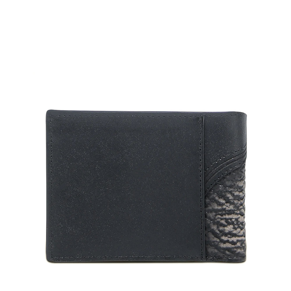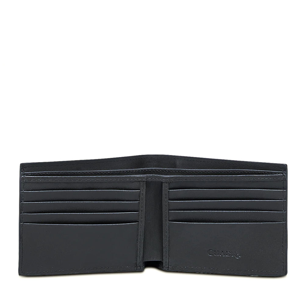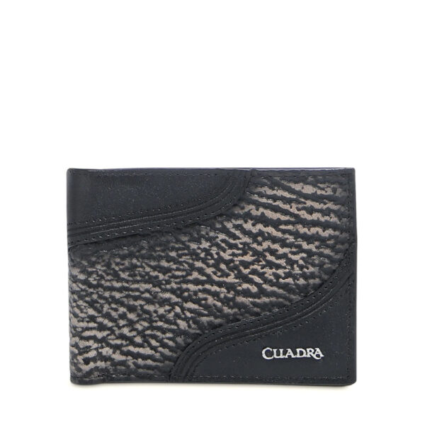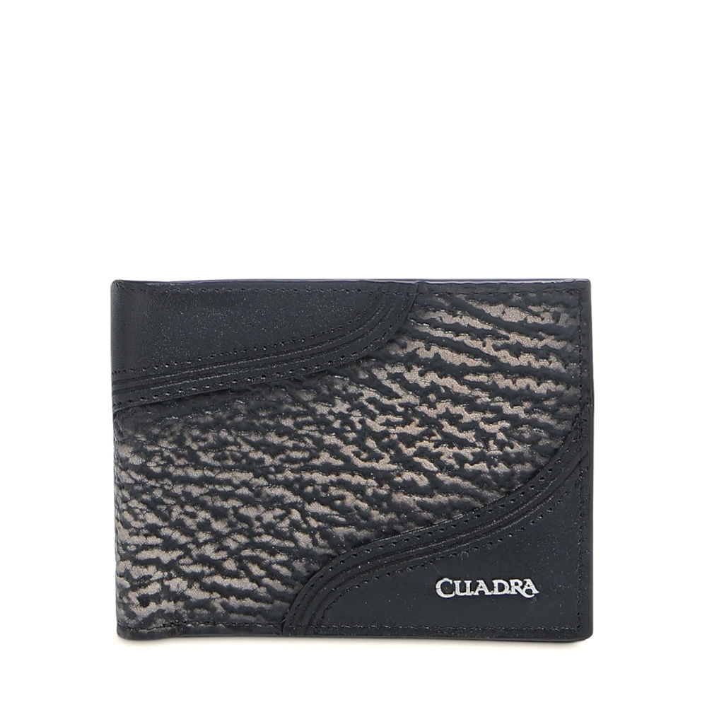 Billetera en piel genuina de tiburón y piel de bovino para caballero. Al frente presenta aplicación metálica del logotipo Cuadra, tejido y grabado láser en motivos orgánicos. En su interior cuenta con ocho espacios para tarjetas y dos espacios para efectivo.