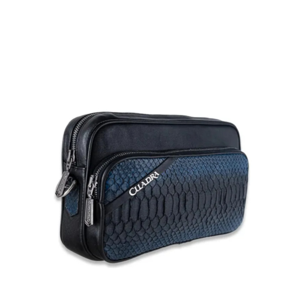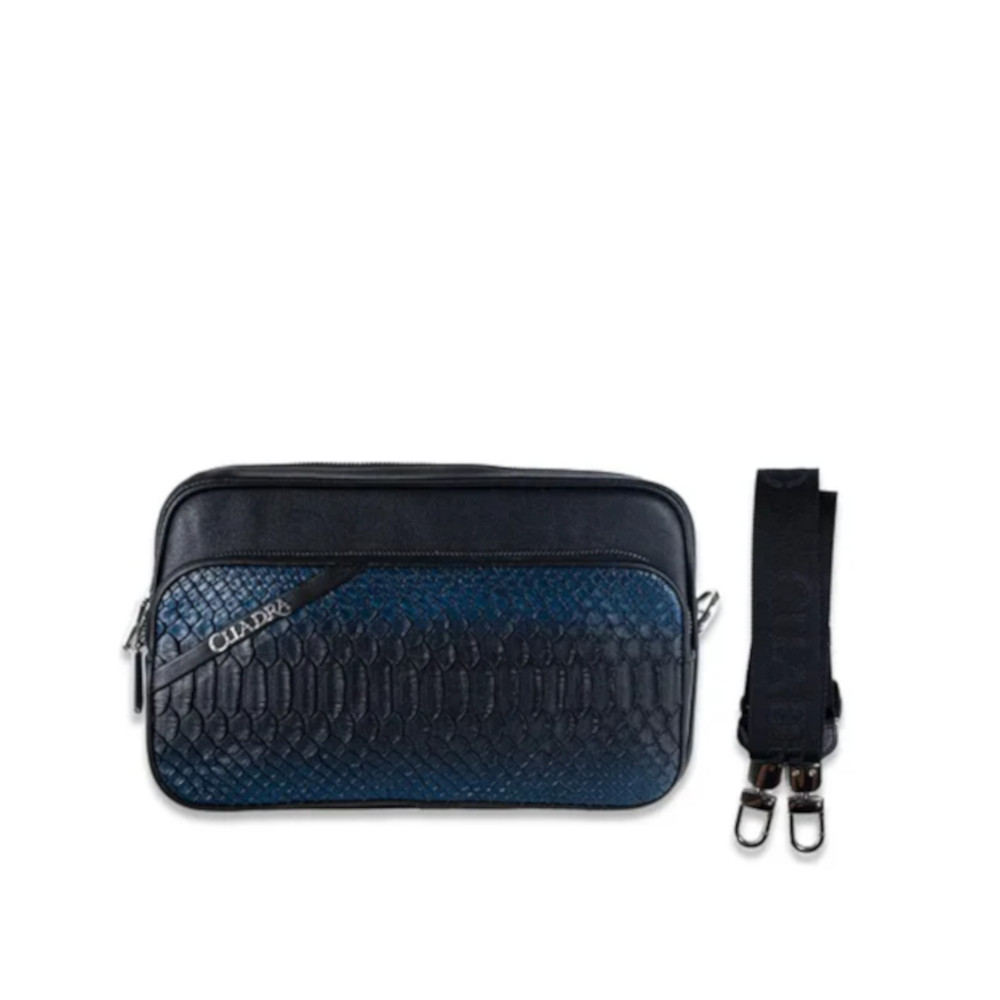 Bolsa para mujer en piel genuina de pitón y piel de bovino. Al frente presenta aplicación metálica de logotipo Cuadra.