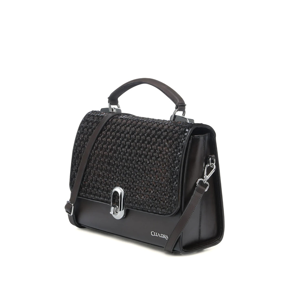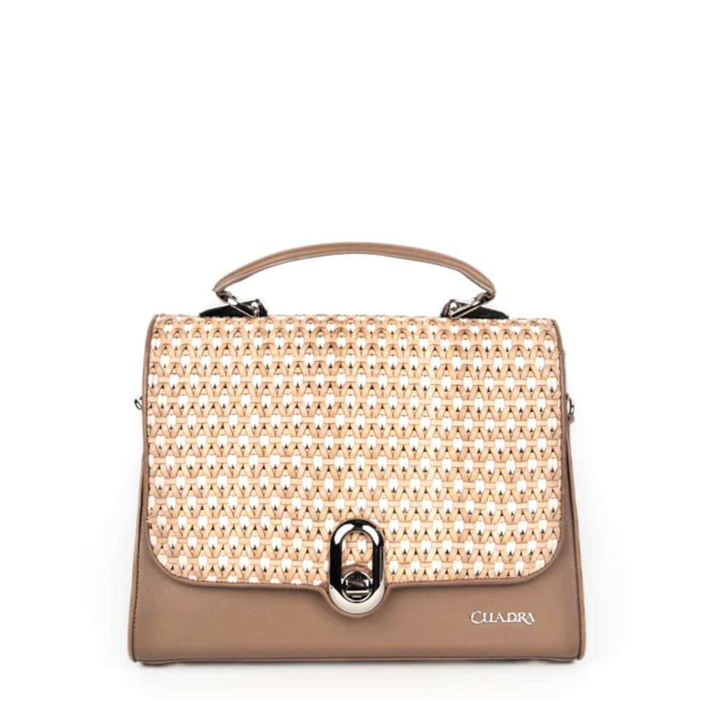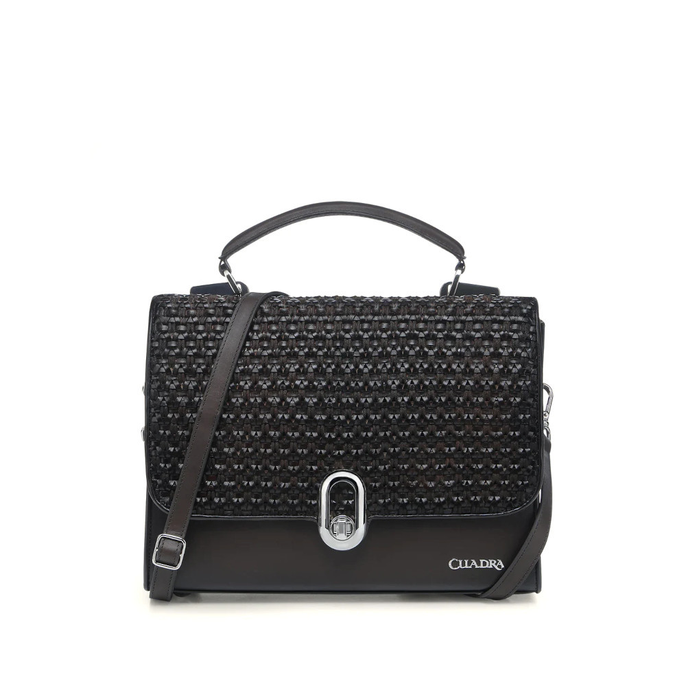 Bolsa de mano para dama en piel genuina de bovino. Con tapa entretejida de manera artesanal y aplicación de logotipo Cuadra al frente. En su interior cuenta con un compartimento. En la parte trasera cuenta con un bolsillo que cierra con broche. Con asa corta sujeta por aplicaciones metálicas y asa larga desmontable y ajustable. Asegurada con broche metálico.