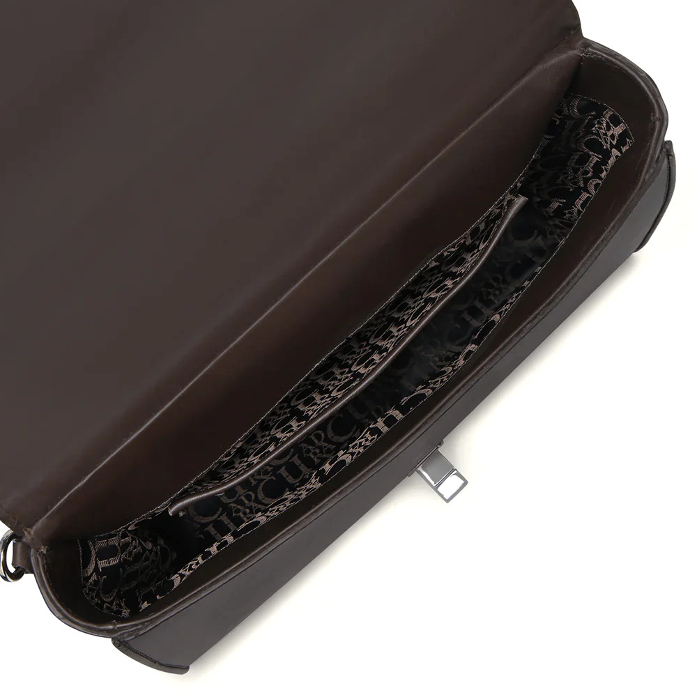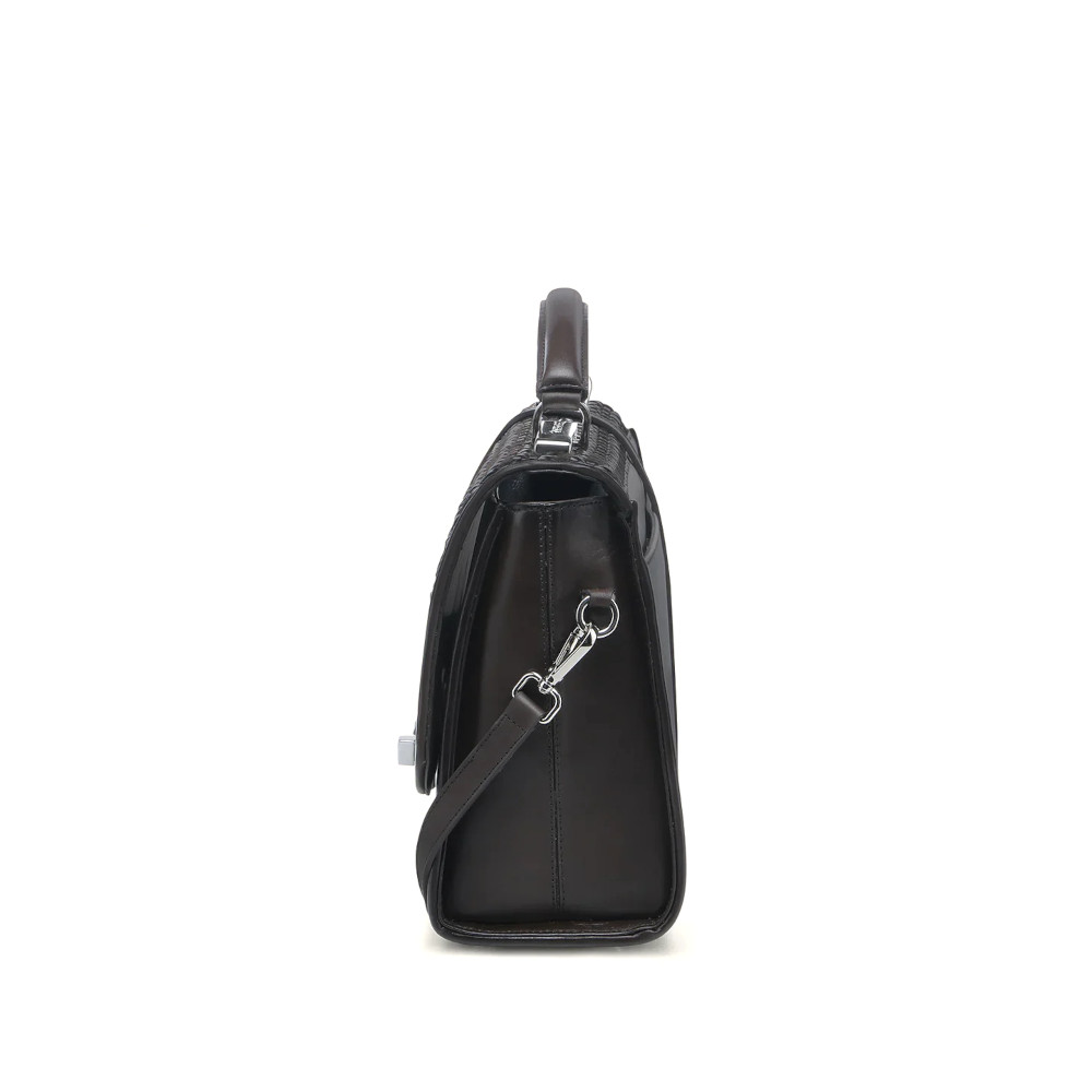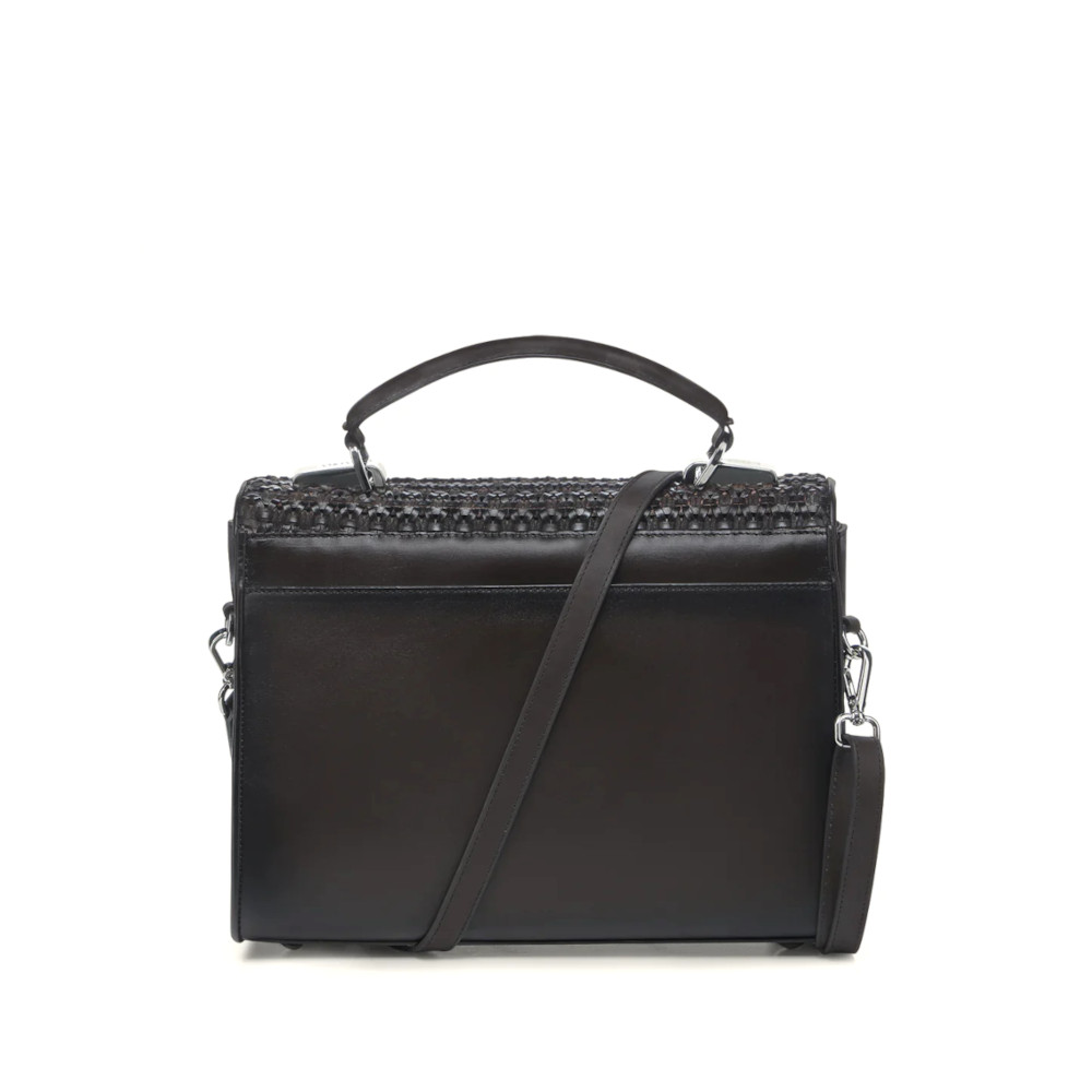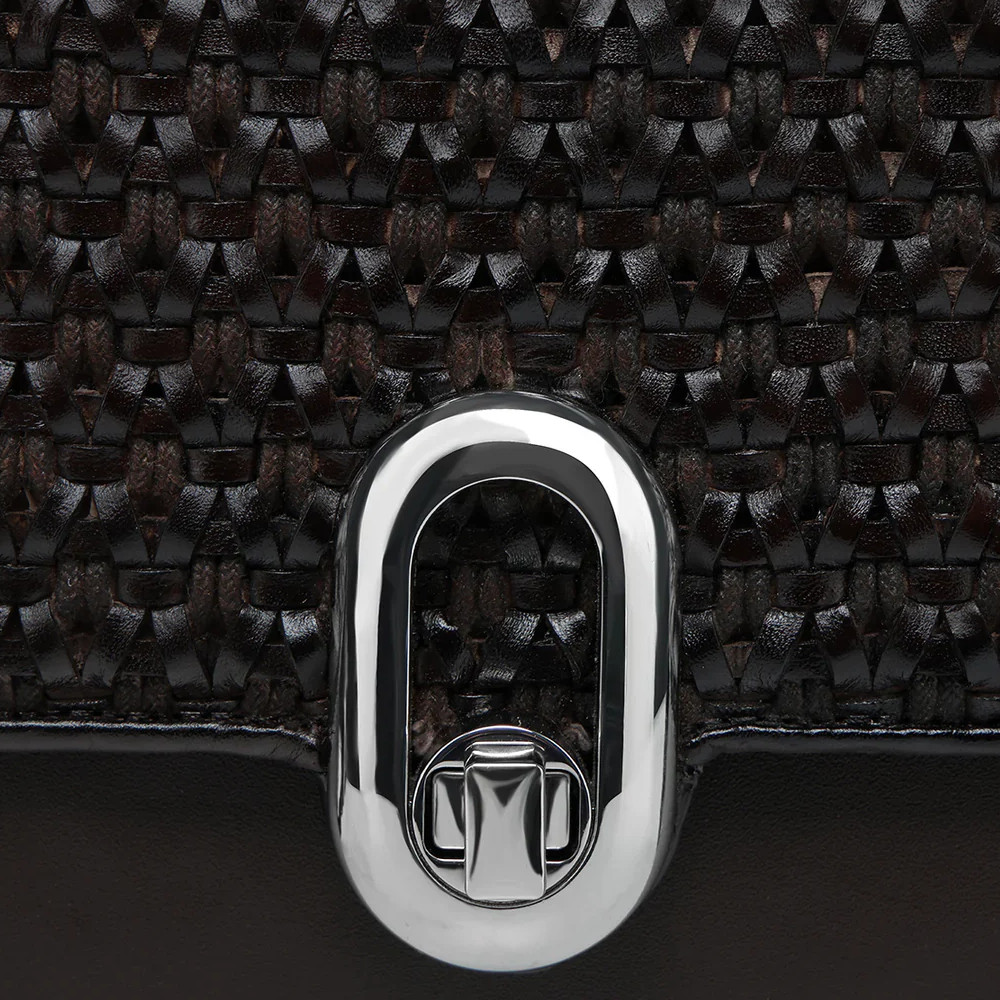 Bolsa de mano para dama en piel genuina de bovino. Con tapa entretejida de manera artesanal y aplicación de logotipo Cuadra al frente. En su interior cuenta con un compartimento. En la parte trasera cuenta con un bolsillo que cierra con broche. Con asa corta sujeta por aplicaciones metálicas y asa larga desmontable y ajustable. Asegurada con broche metálico.