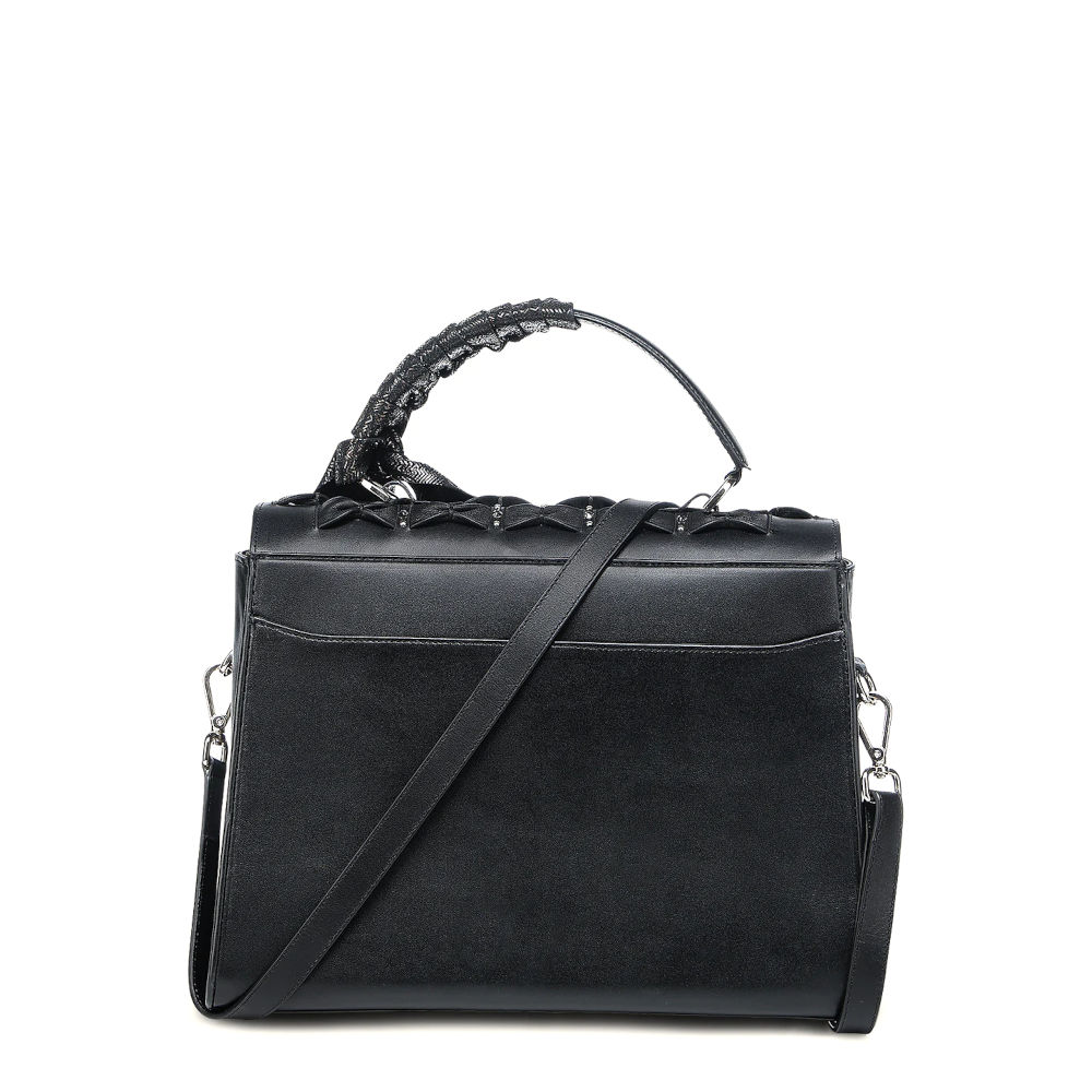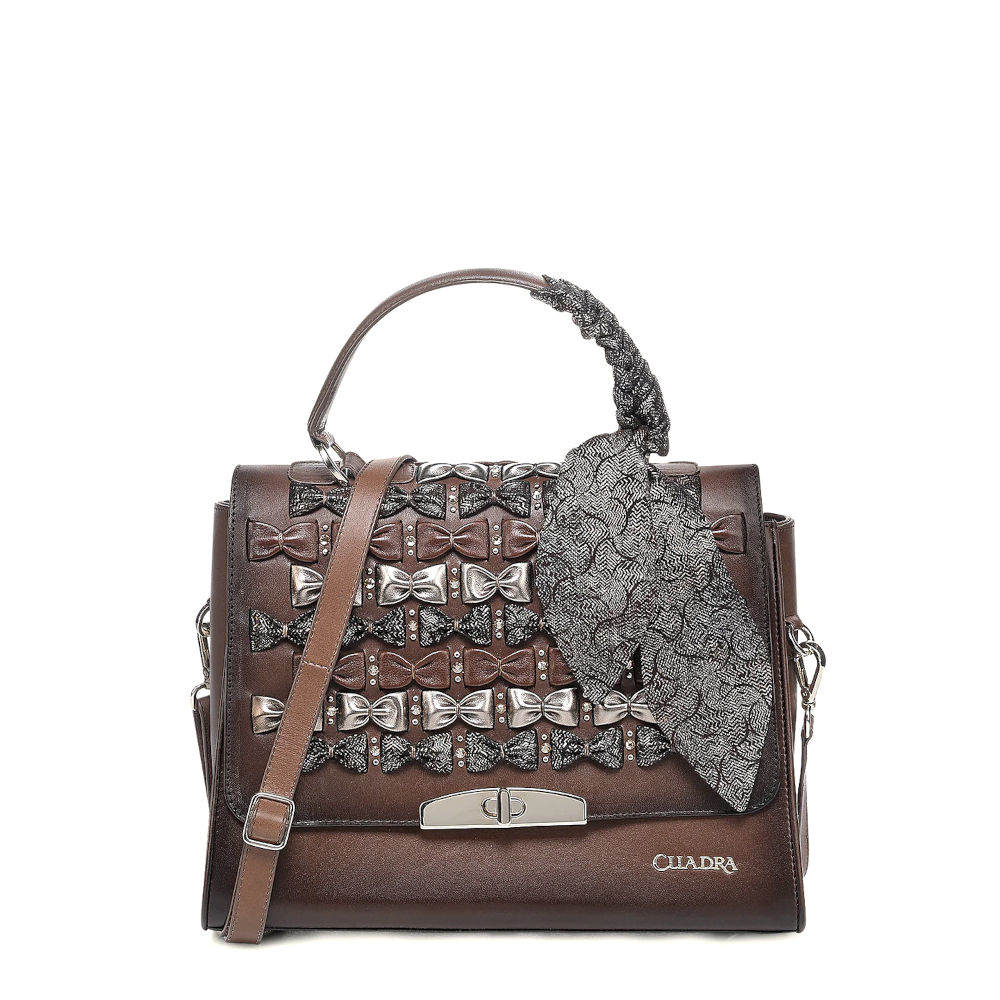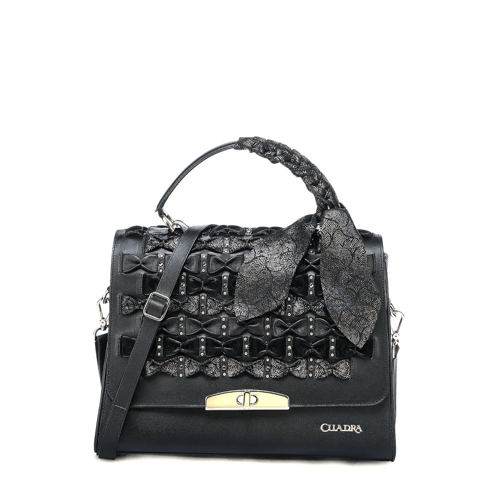 Bolsa de mano para dama en piel genuina de bovino. Al frente presenta aplicación metálica del logotipo Cuadra, entretejido artesanal con contraste de color y aplicación de cristales auténticos swarovski. Con asa larga ajustable y desmontable y asa corta envuelta con una mascada de piel de ovino perforada que finaliza en un moño. Cuenta con un compartimento en la parte trasera y con dos compartimentos en el interior uno de ellos asegurado con cierre. Asegurada con broche metálico e imanes.