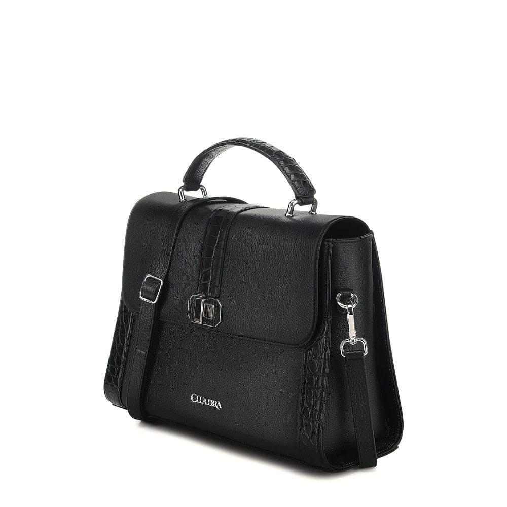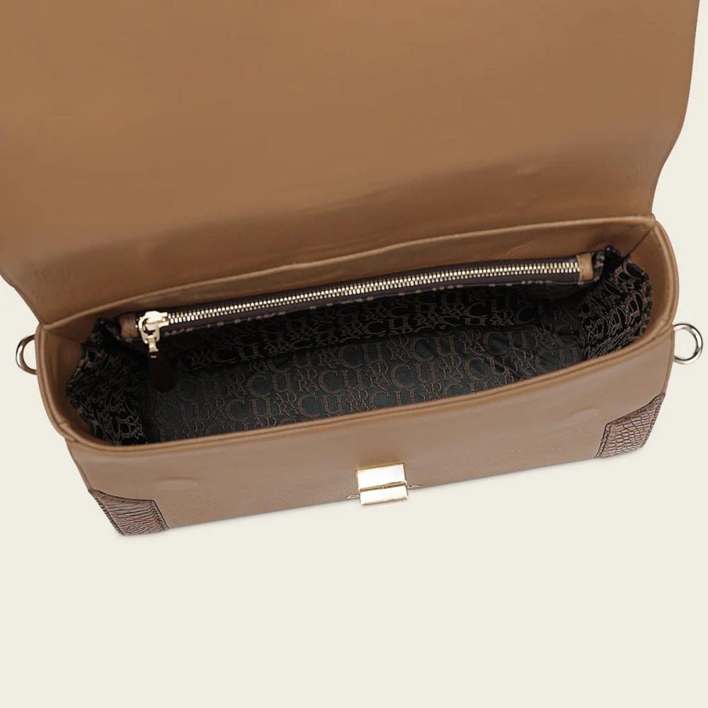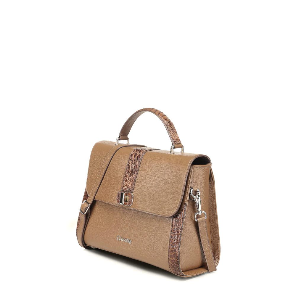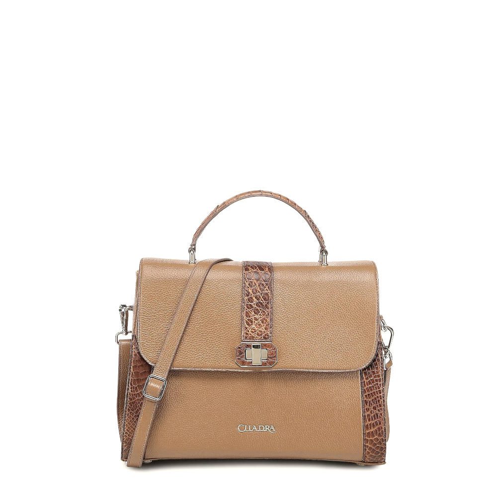Bolsa satchel para dama en piel genuina de aligátor y piel de bovino. Presenta aplicaciones de piel de aligátor al frente, en los costados y en el asa corta. Con aplicación metálica del logotipo Cuadra. El interior cuenta con un bolsillo con cierre y la parte trasera con un bolsillo con imán. Asa larga ajustable y desmontable. Asegurado con broche giratorio.