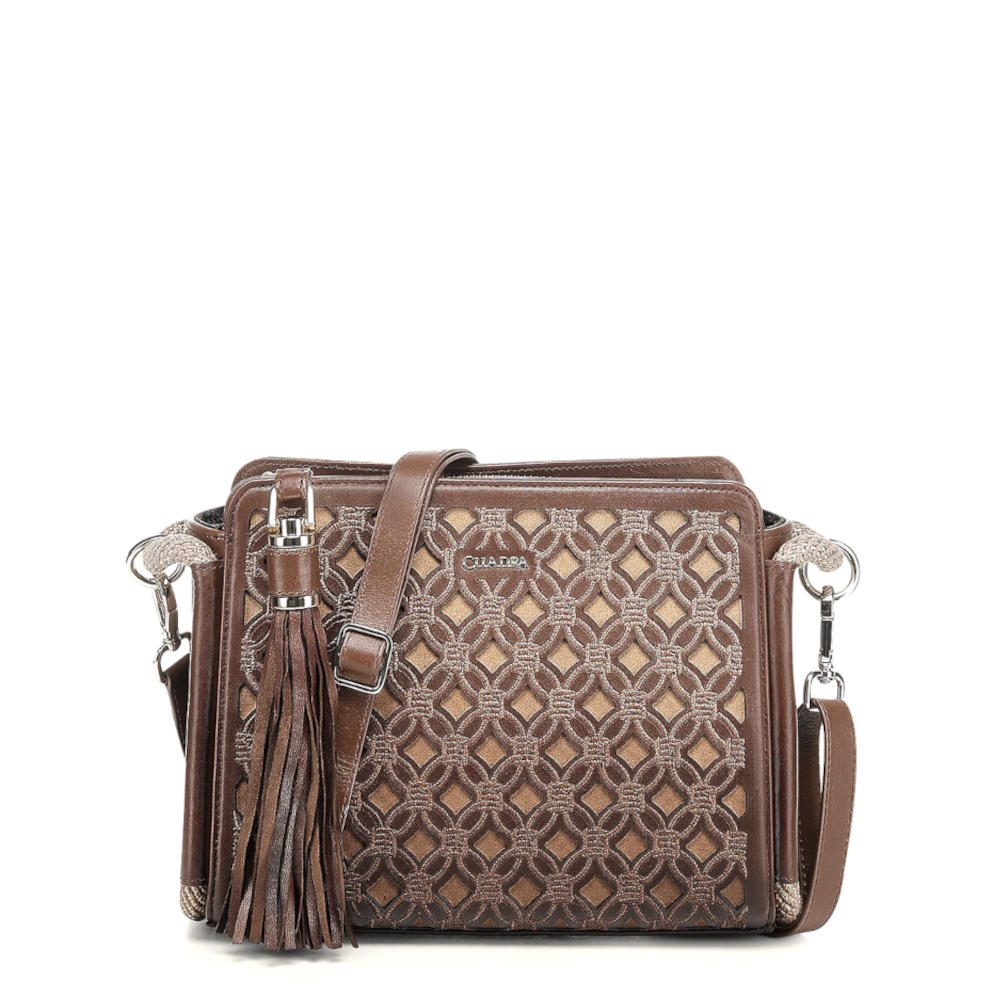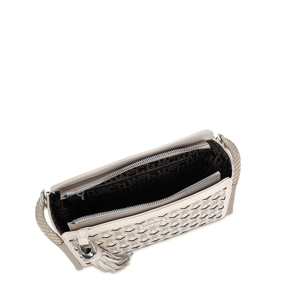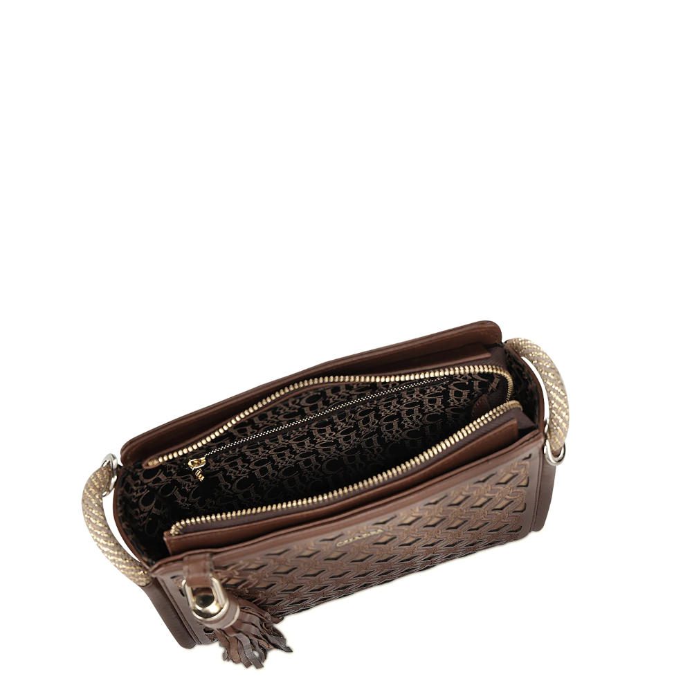 Bolsa Crossbody para dama en piel genuina de bovino. Presenta aplicación metálica del logotipo, bordado en alto relieve, perforaciones láser con motivos geométricos y una borla colgante en piel genuina. Con cuerdas decorativas a los costados. La parte interna cuenta con un bolsillo con cierre. Con asa larga, ajustable y desmontable. Asegurado con cierre.