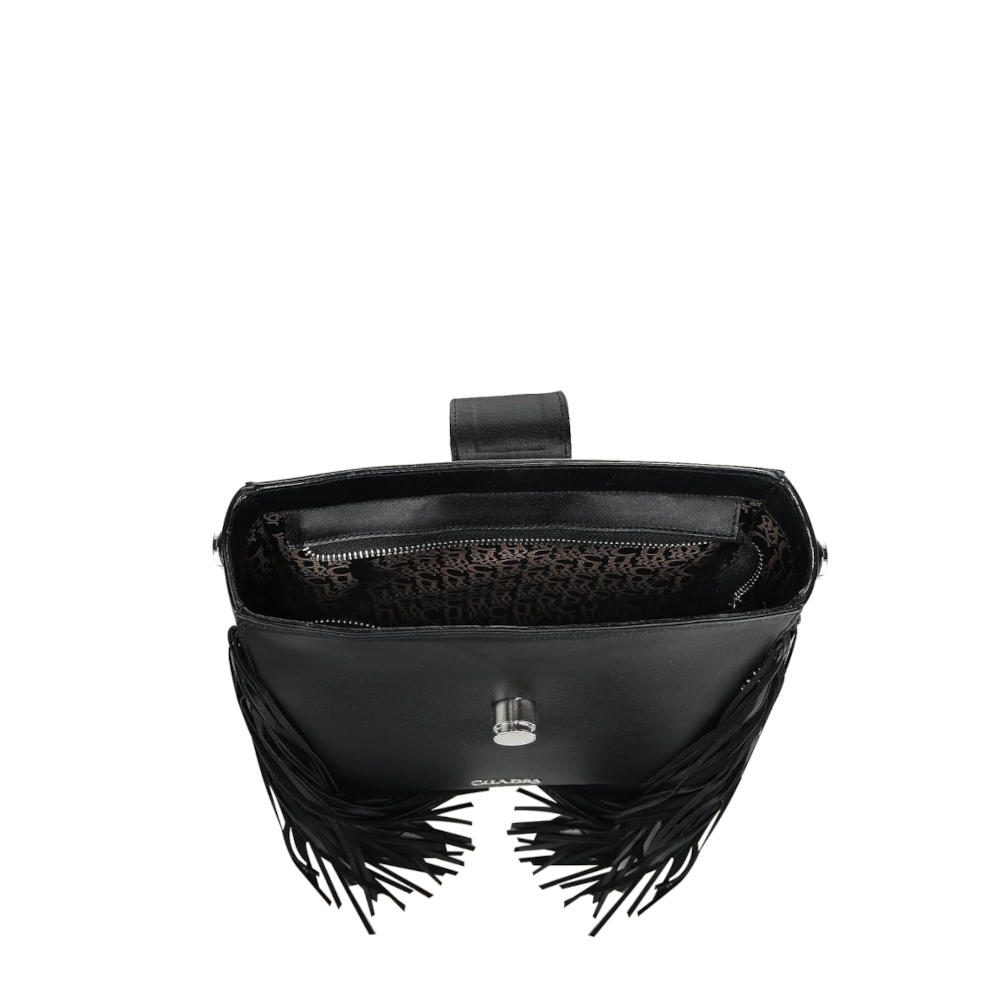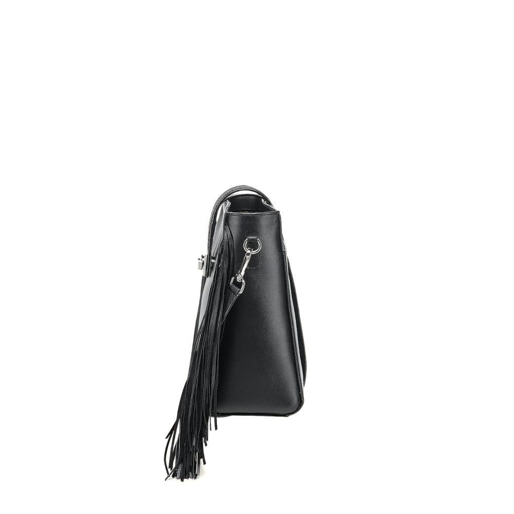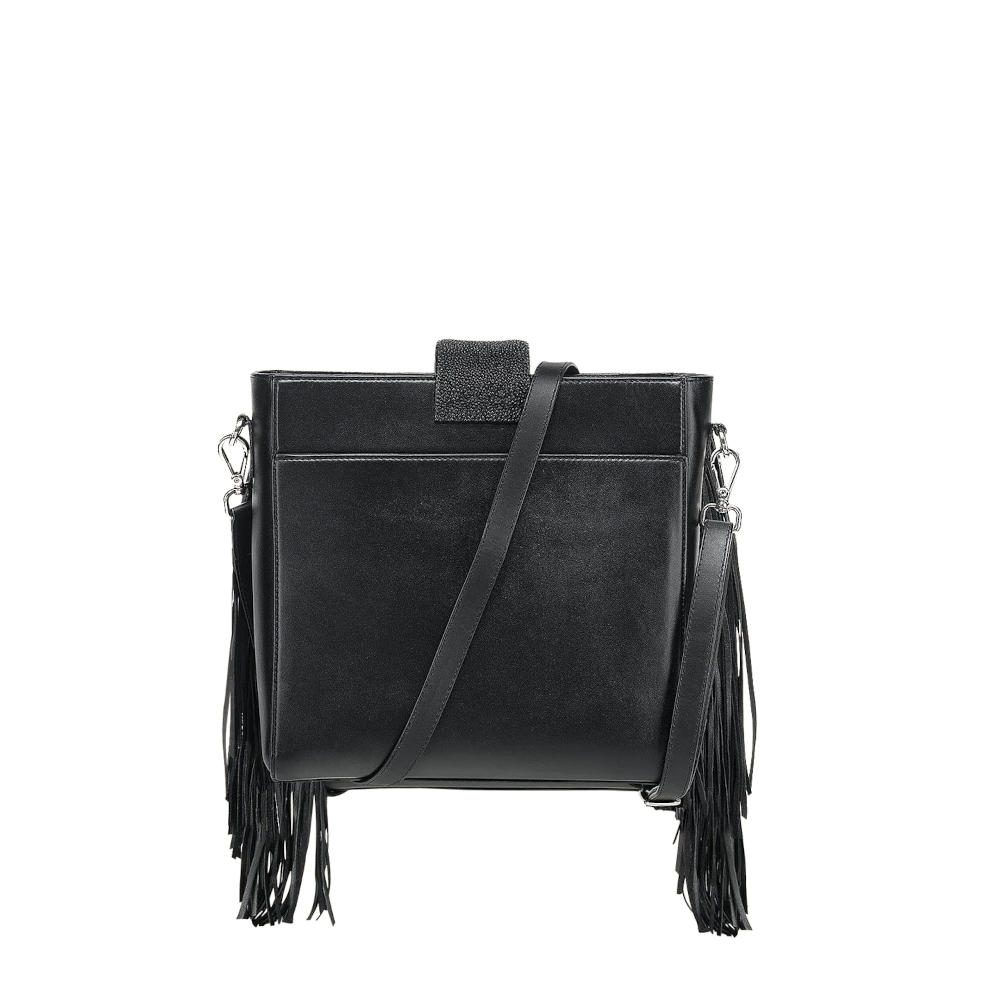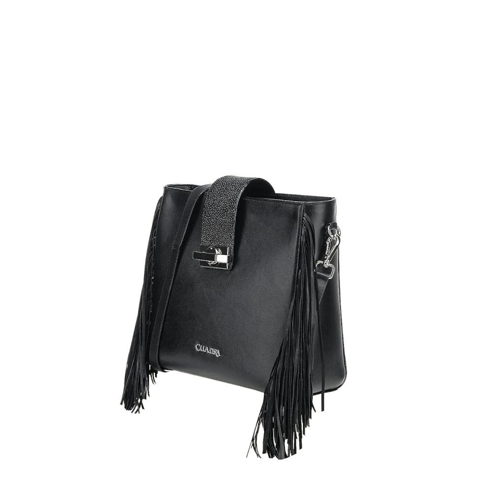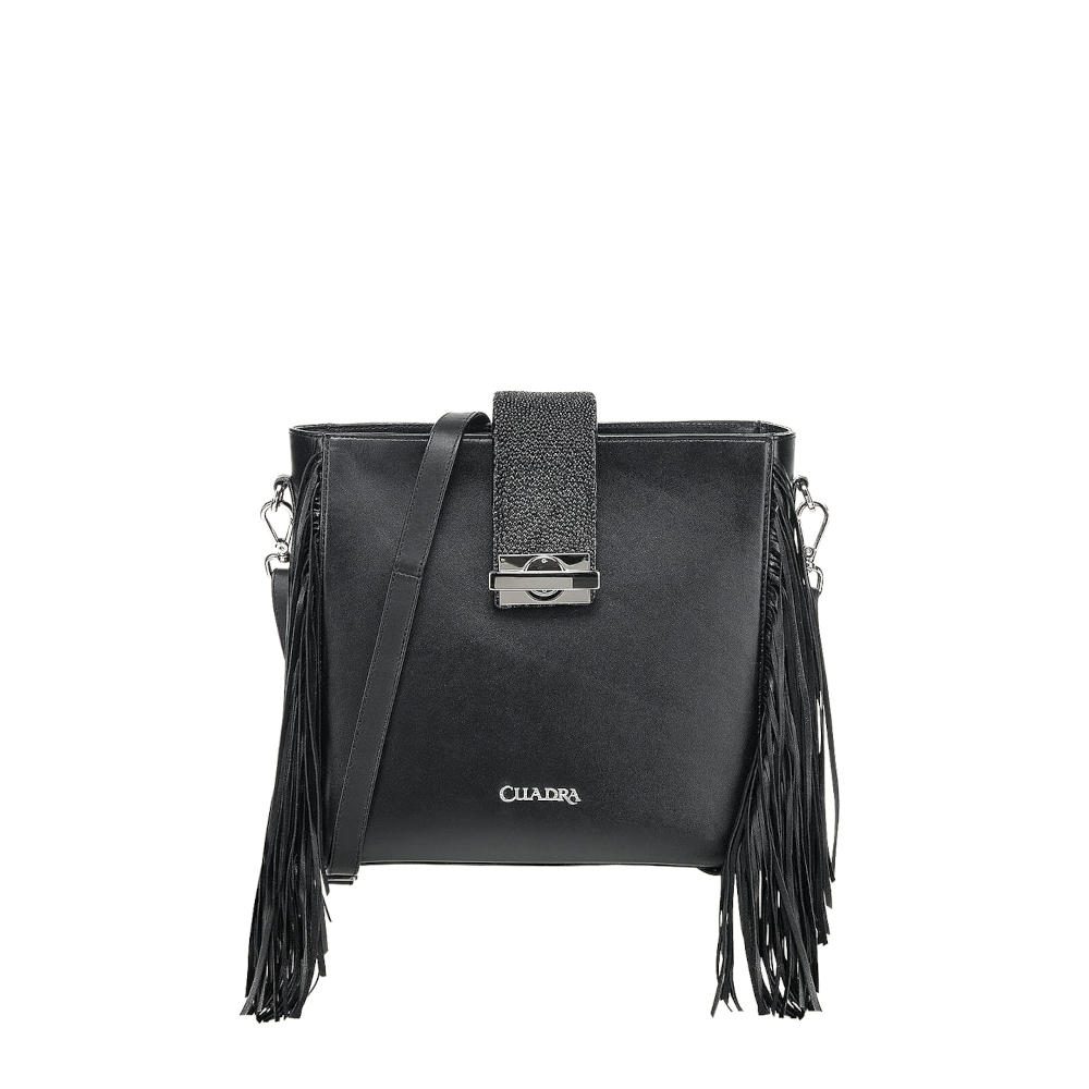 Bolsa Crossbody para dama en piel genuina de mantarraya y piel de bovino. Presenta aplicación metálica del logotipo Cuadra. Con flecos en piel genuina de ovino a los costados. La parte trasera cuenta con un bolsillo asegurado con imán. En su interior cuenta con dos bolsillos, uno de ellos asegurado con cierre. Asa larga ajustable y desmontable. Asegurada con cierre y una correa en piel de mantarraya sujeta con broche.
