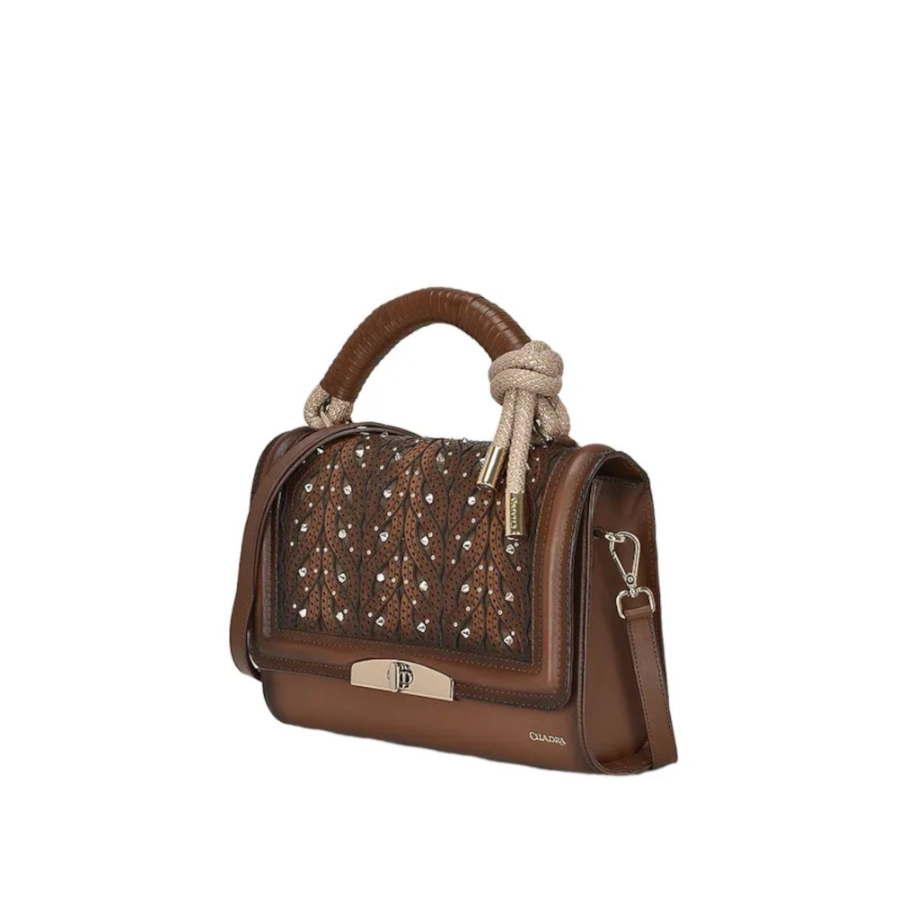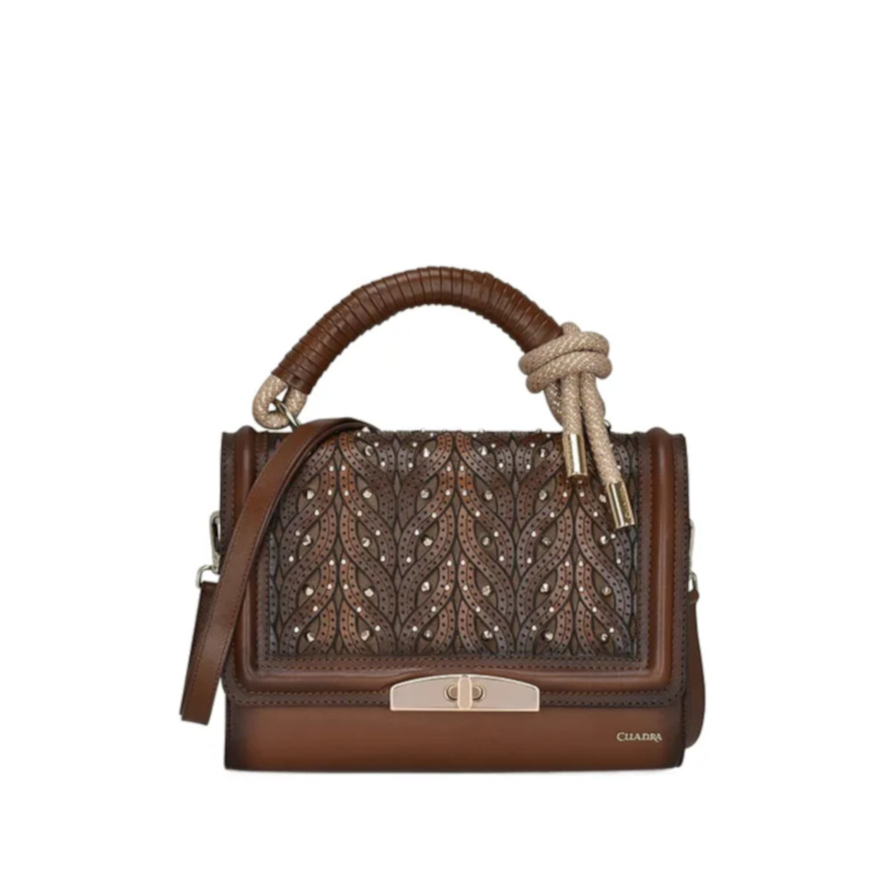 Bolsa para dama en piel de bovino. Al frente presenta aplicación metálica de logotipo Cuadra.