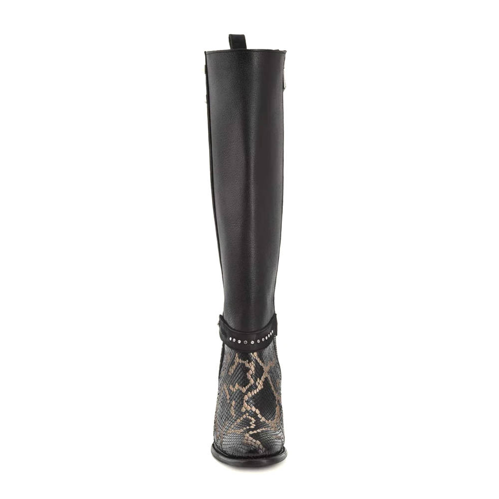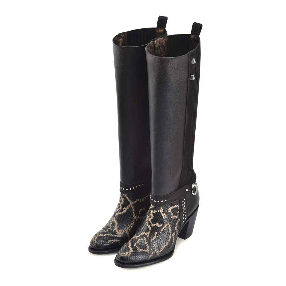 Bota alta para dama en piel genuina de pitón y piel de bovino. Presenta bordado sobre la escama y arnés decorativo con estoperoles. Cuenta con grabado láser con logo Cuadra. Aplicaciones textiles elásticas en el tubo y cierre interno. Suela de cuero con hule.
