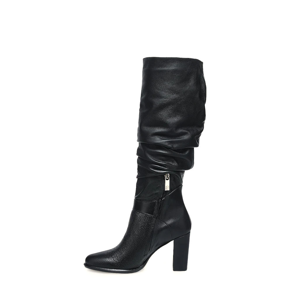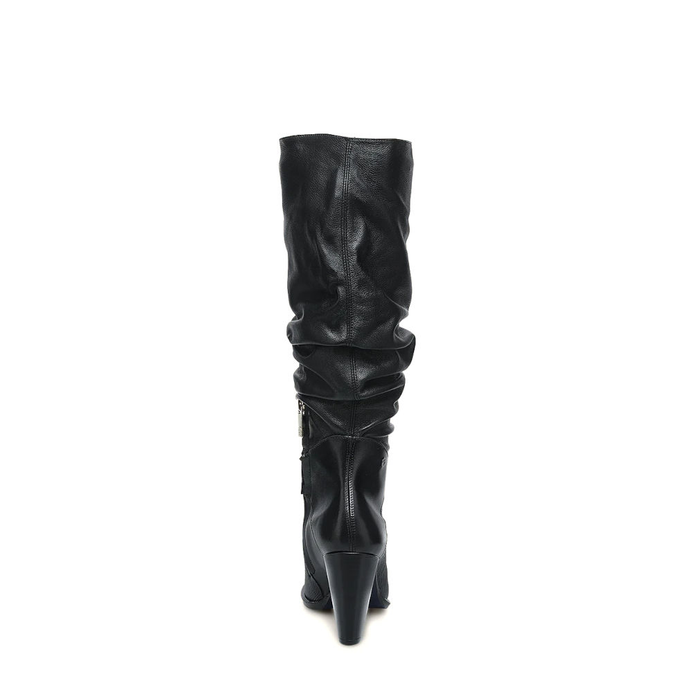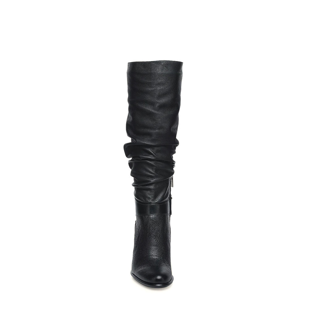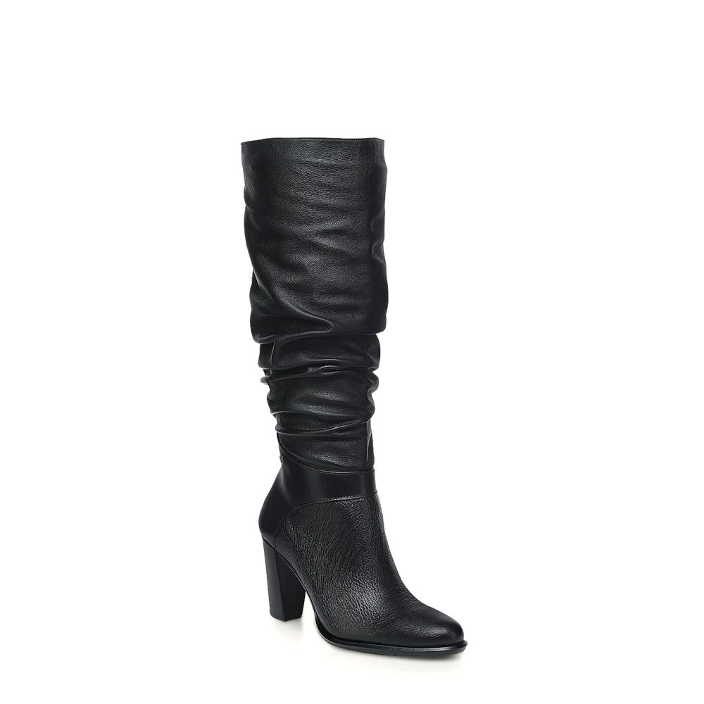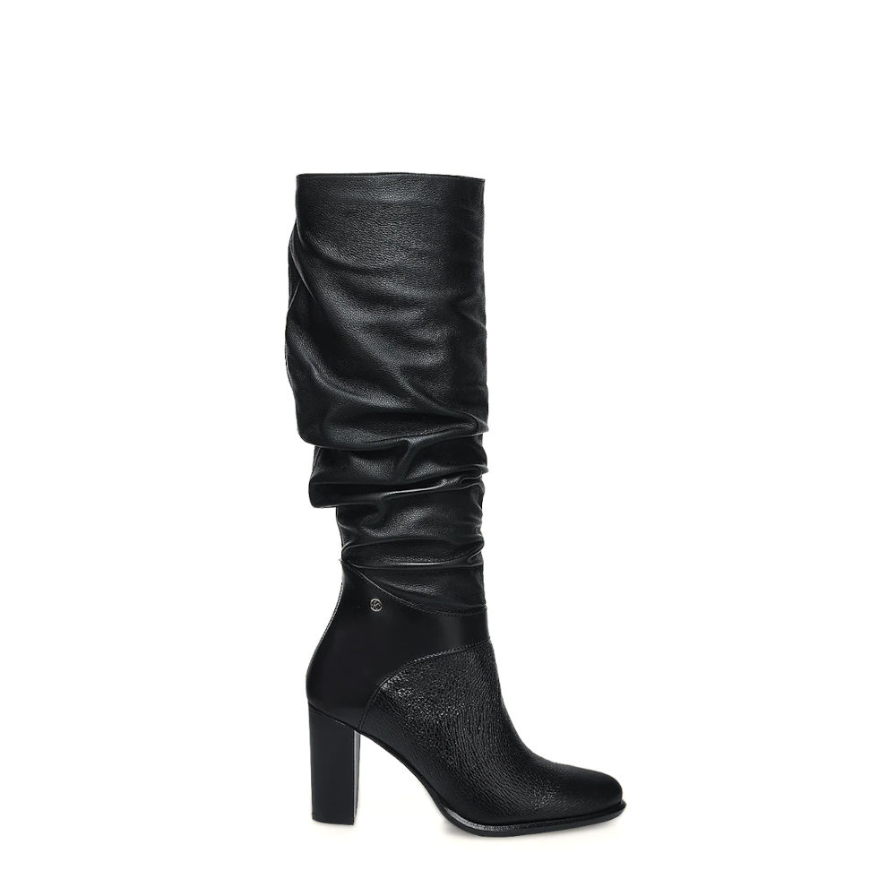 Bota de vestir para dama en piel genuina de venado y piel de bovino. Presenta acabado corrugado y aplicación metálica del monograma Franco Cuadra. Suela de cuero de doble densidad con injerto de TPU.