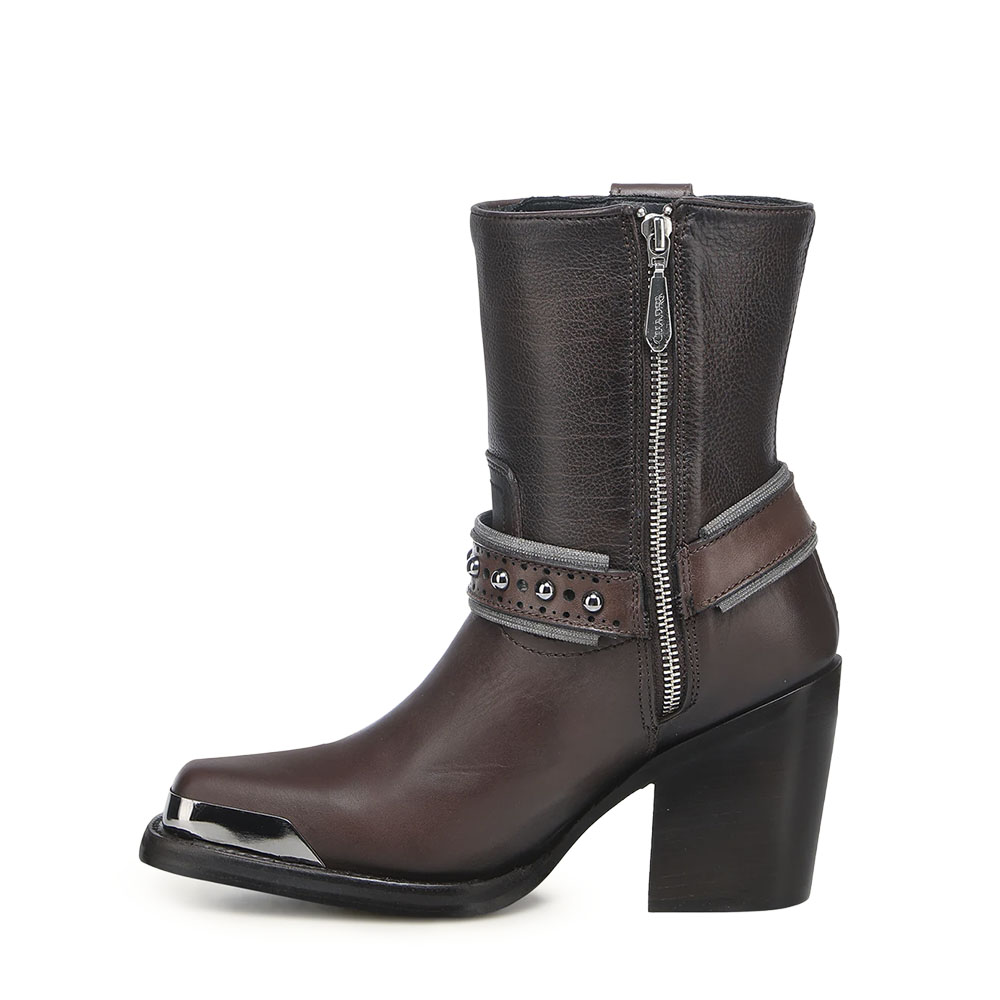 Botín biker para dama en piel genuina de bovino. Presenta correa decorativa alrededor del tobillo con herrajes y aplicación metálica en forma de herradura. En el costado presenta aplicación de estoperoles. Ajustada con cierre interno y aplicación elástica forrada en piel para mejor ajuste. Cuenta con las nuevas tecnologías: tubo con entretelas suaves, planta Ortholite y plantilla flex removible.
