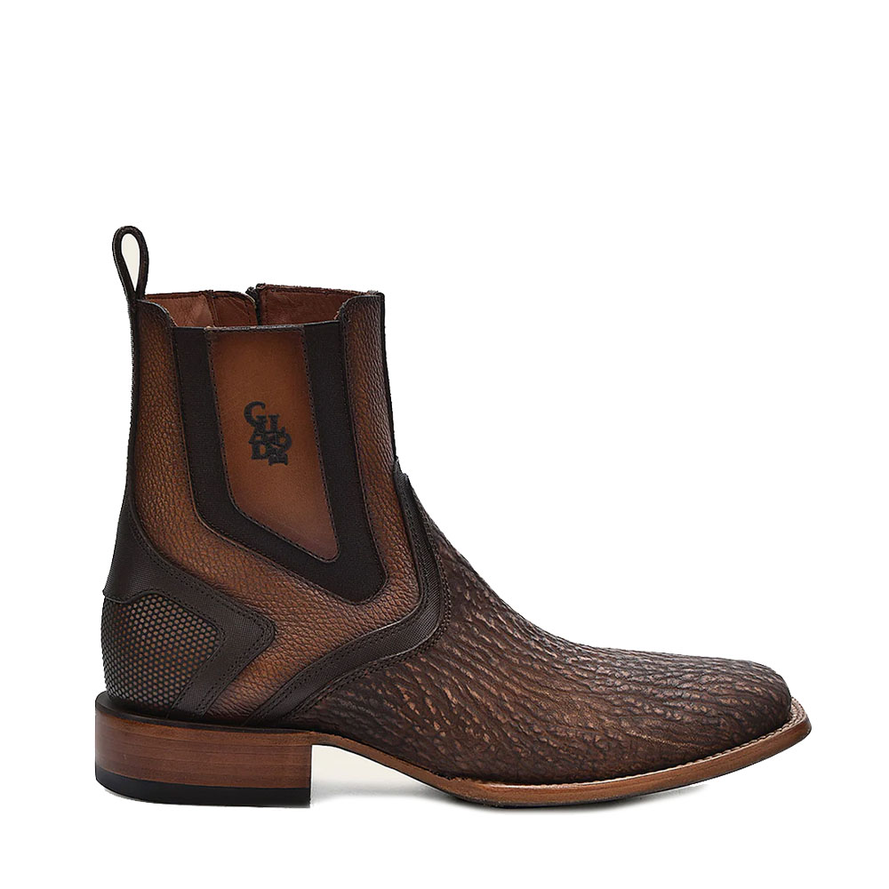 Botín urbano para caballero en piel genuina de tiburón. Presenta un acabado mate. La parte trasera y lateral cuentan con detalles grabados en láser. Ajustada con cierre interno. Suela de cuero con hule.