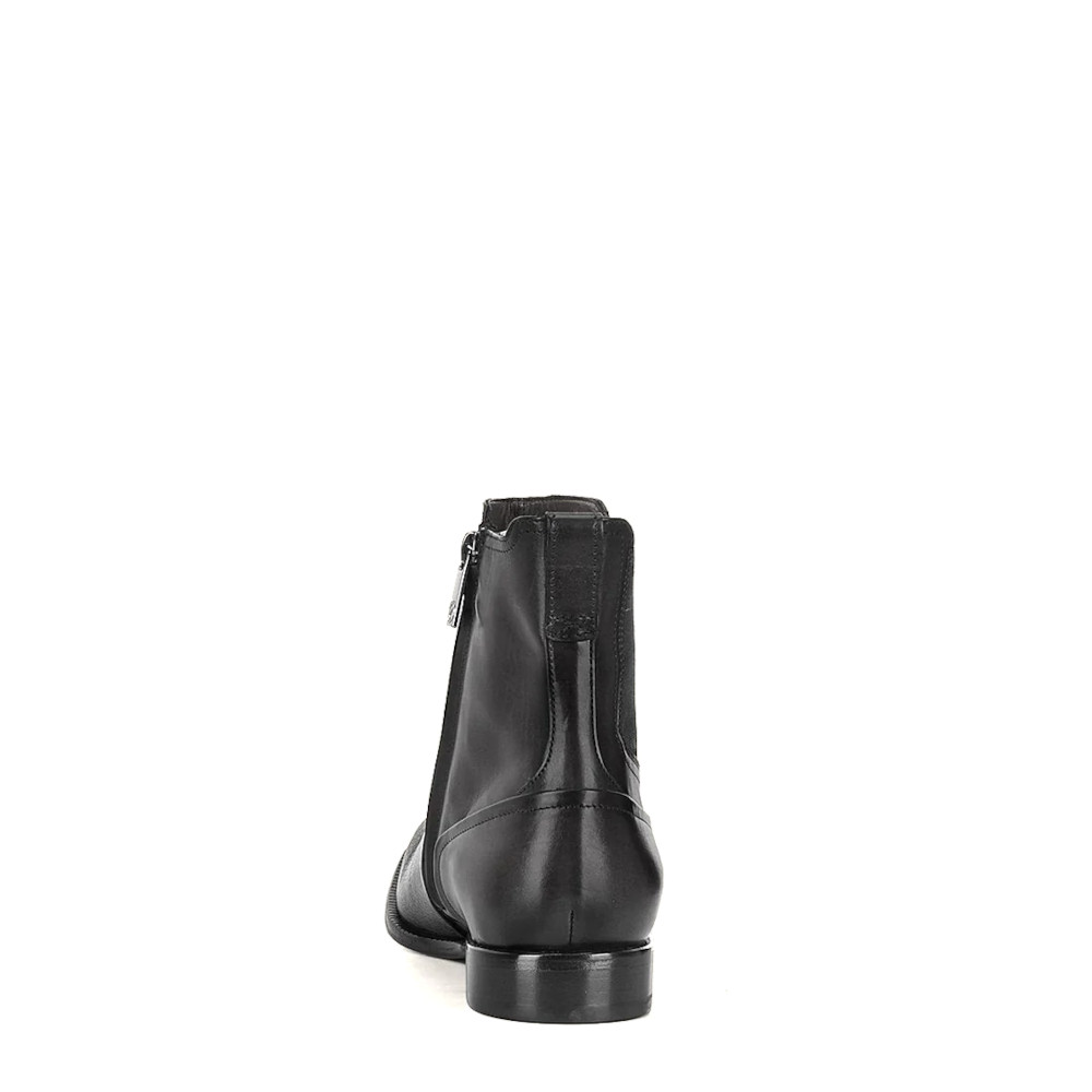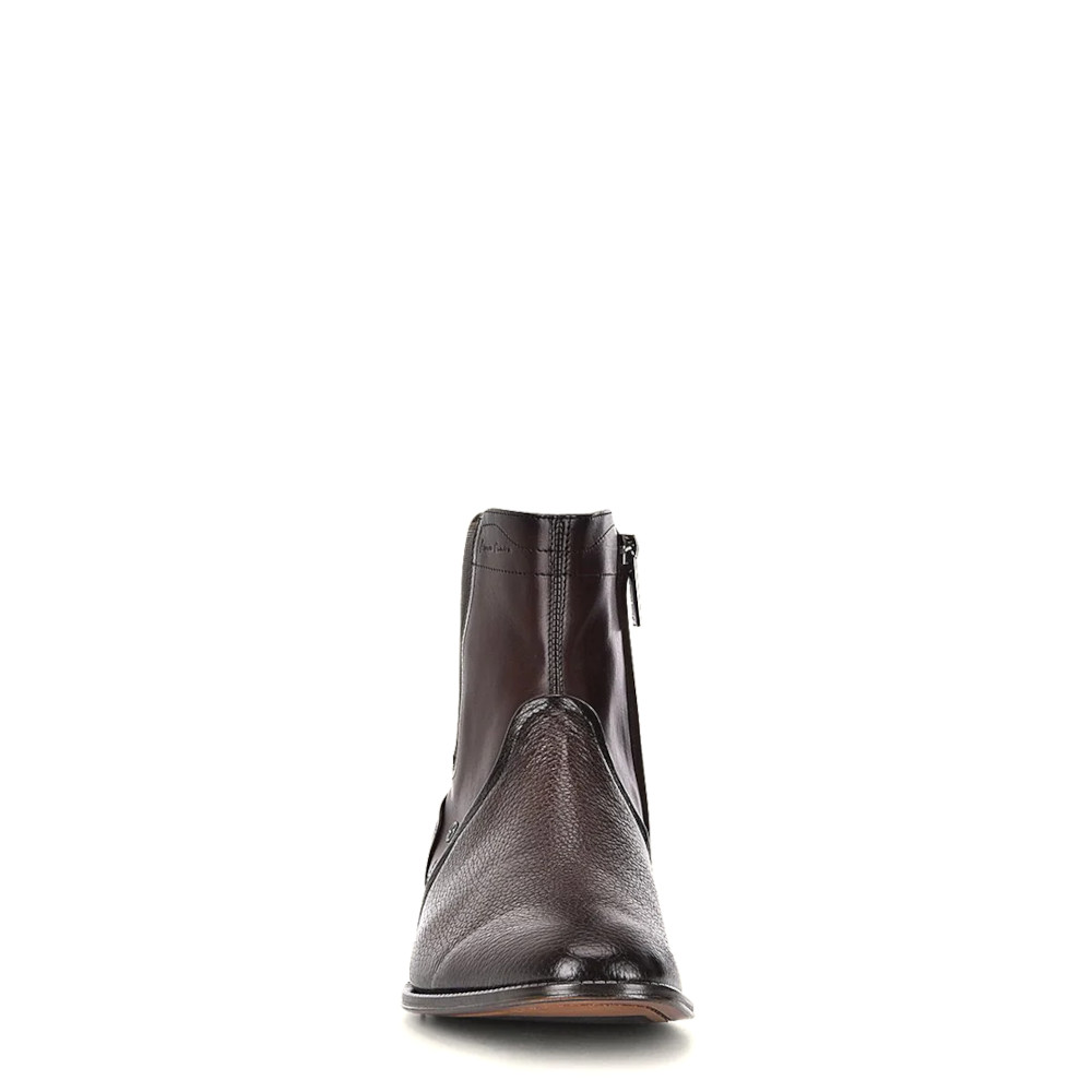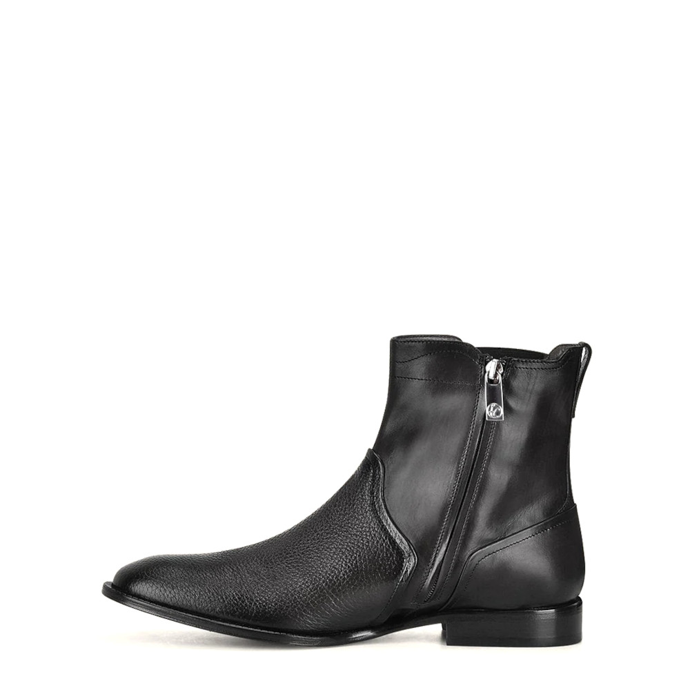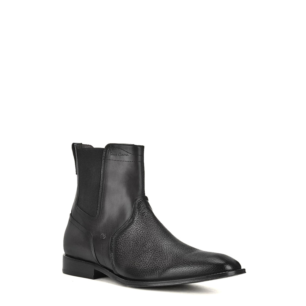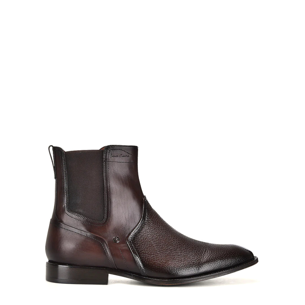 Botín de vestir para caballero en piel genuina de venado y piel de bovino. En un costado presenta aplicación metálica de monograma Franco Cuadra. Ajustado con cierre interno. Con suela de cuero con injerto de TPU.