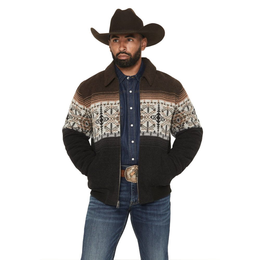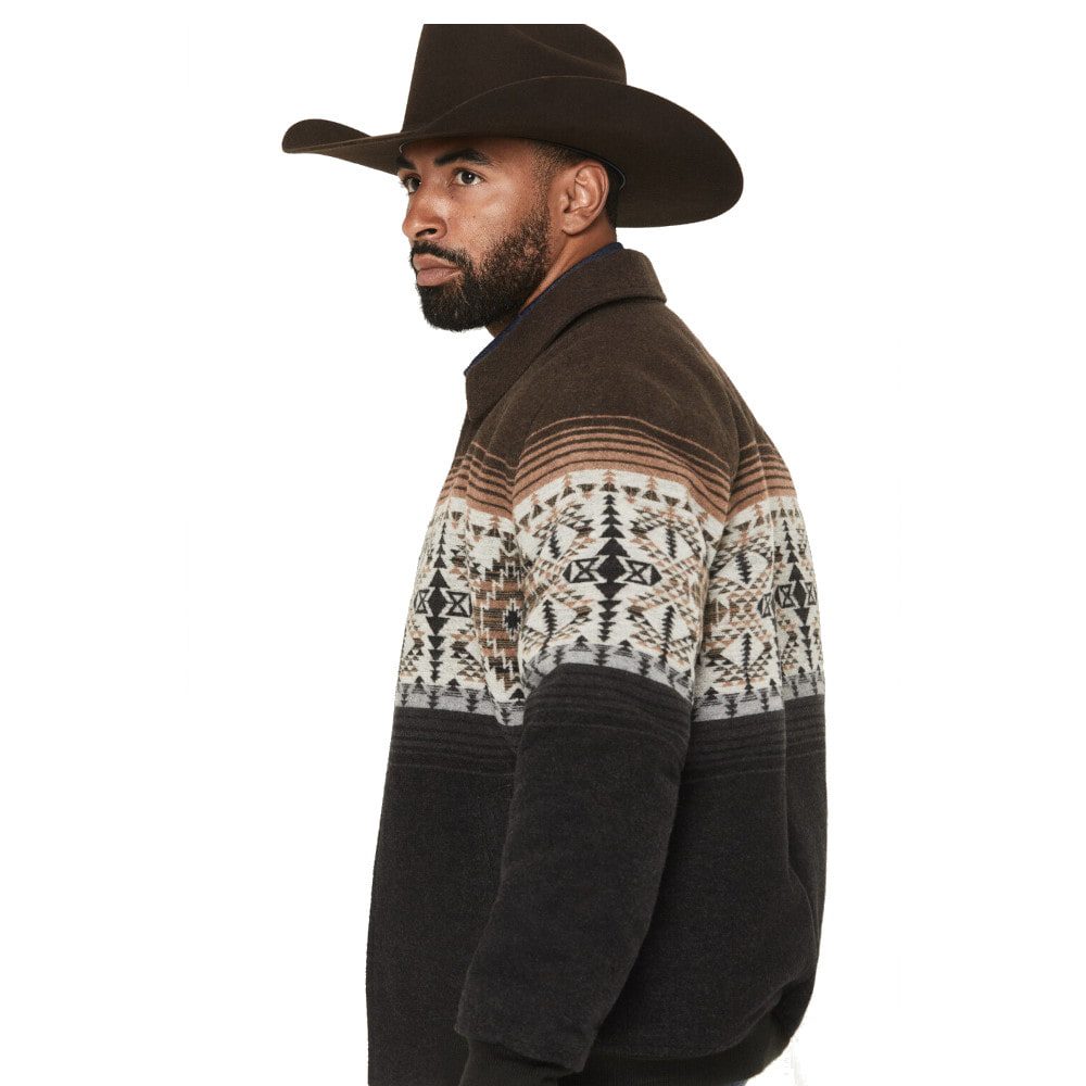 - Diseño de bloques de color marrón y negro con estampado central del suroeste en gris claro, tostado, gris y negro.