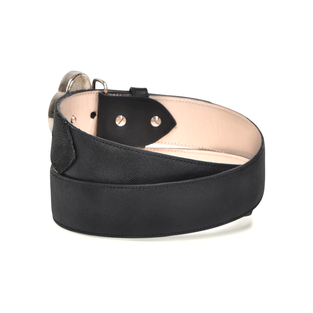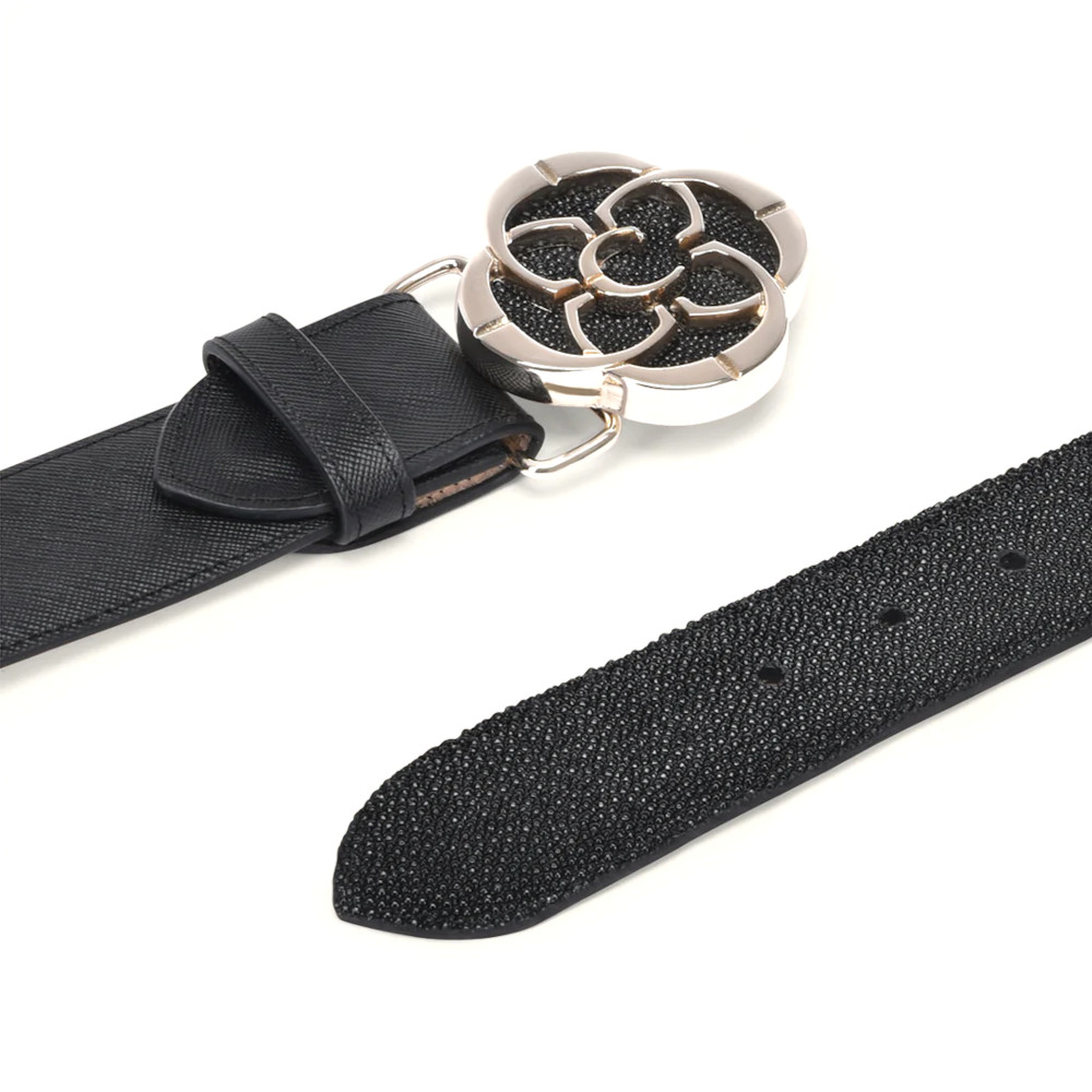 Cinto casual para dama con combinación en piel genuina de mantarraya y piel genuina de bovino. Hebilla personalizada con la marca. Color negro.