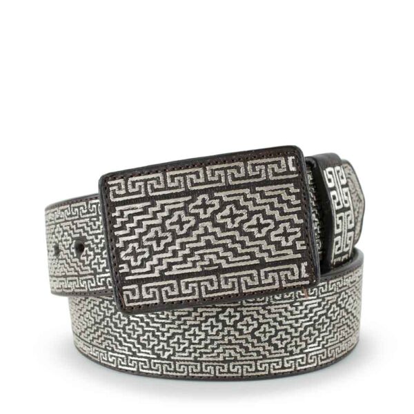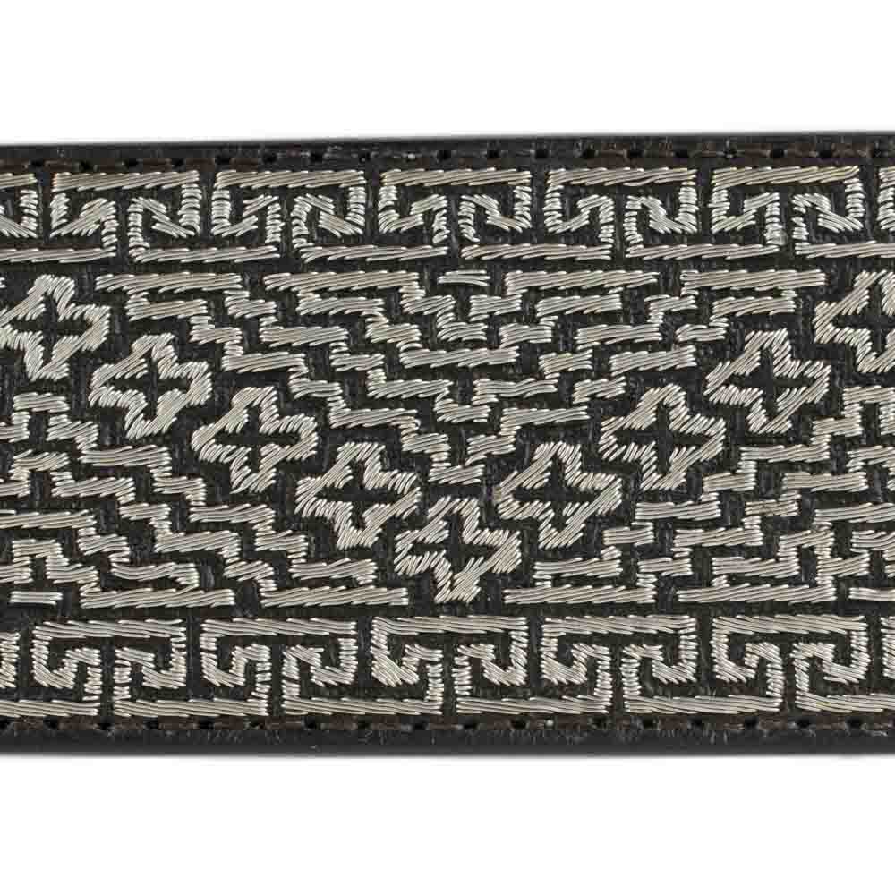 Cinto de Hilo de Plata con diseño de grecas y cruzes. El ancho del cinto es de 2 pulgadas.