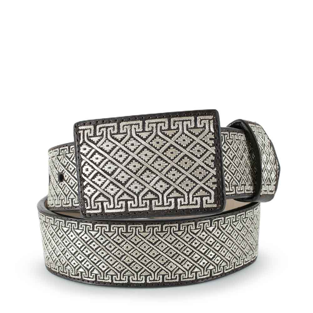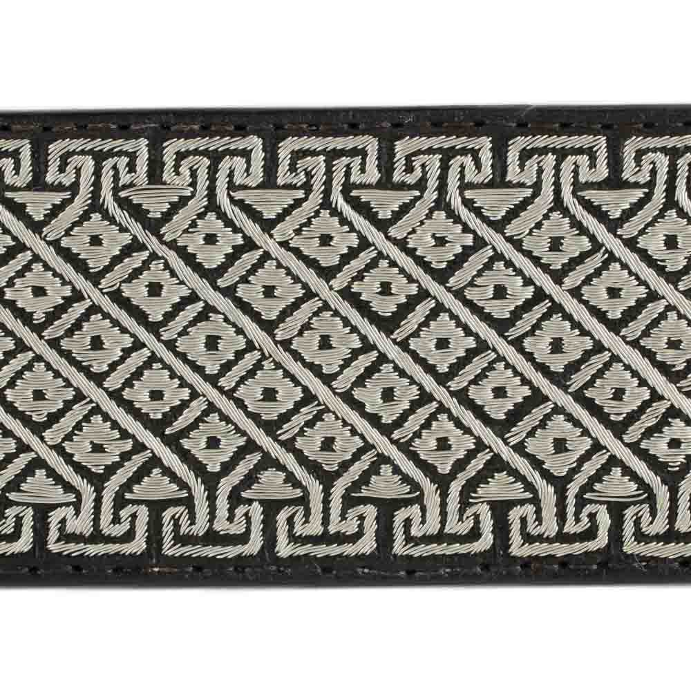 Cinto de Hilo de Plata con diseño de grecas y rombos. El ancho del cinto es de 2 pulgadas.