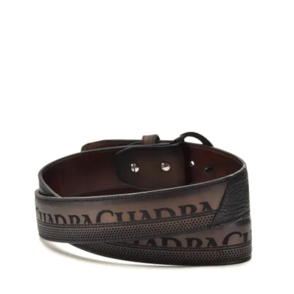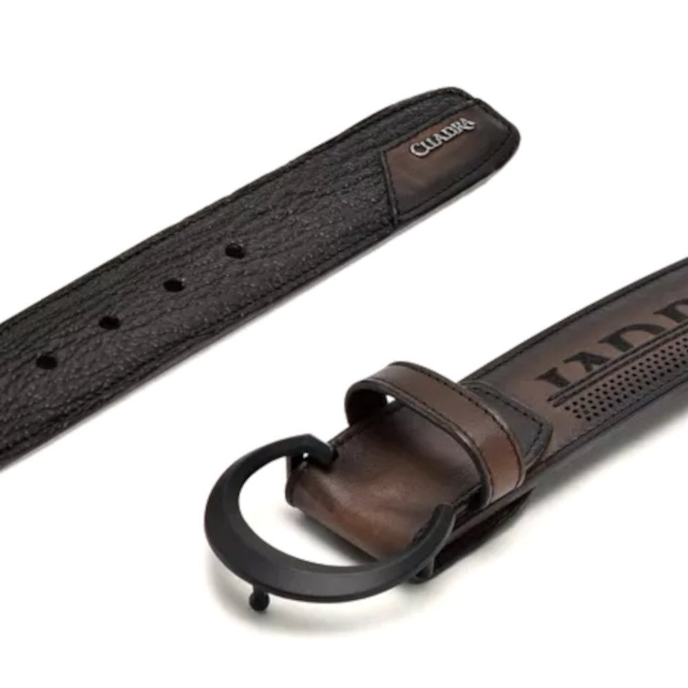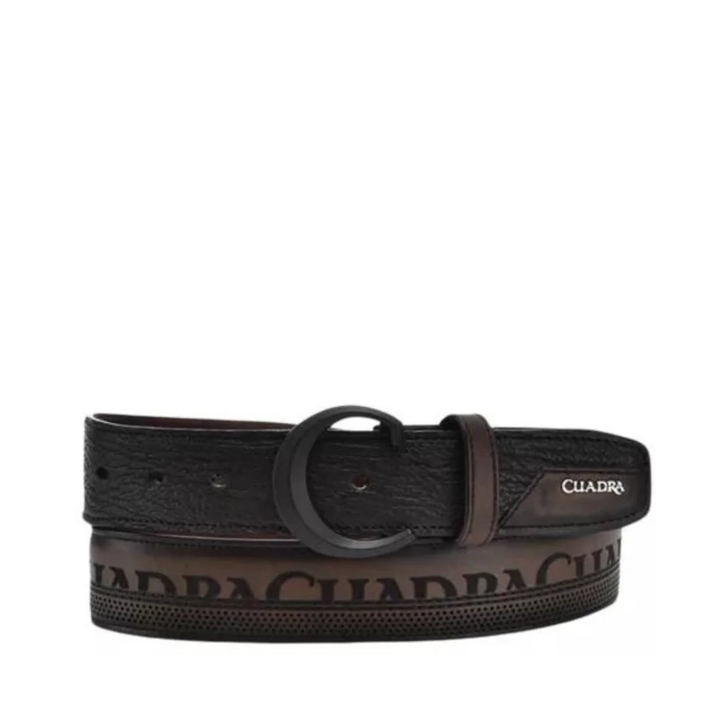 Cinto de vestir para caballero en piel de Tiburón. Presenta detalles de pespunte hecho a mano. Con grabado láser de monograma Cuadra al final de la tira y sobre la hebilla, la cual mide y presenta aplicación metálica de monograma Cuadra.