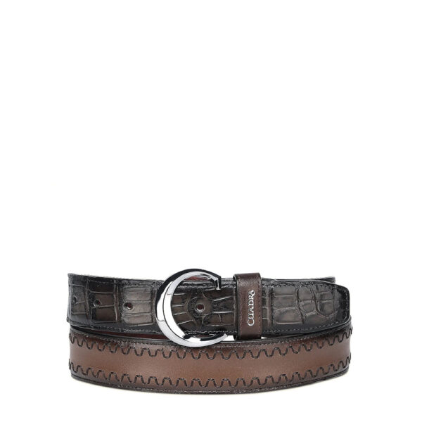 Cinto casual para caballero en piel genuina de alligator y piel de bovino. Presenta piel de alligator en la punta y bordado sobre la piel de bovino con contraste de color. Con aplicación metálica del logotipo Cuadra y hebilla metálica de 38mm del monograma Cuadra. Con forro en piel de bovino.