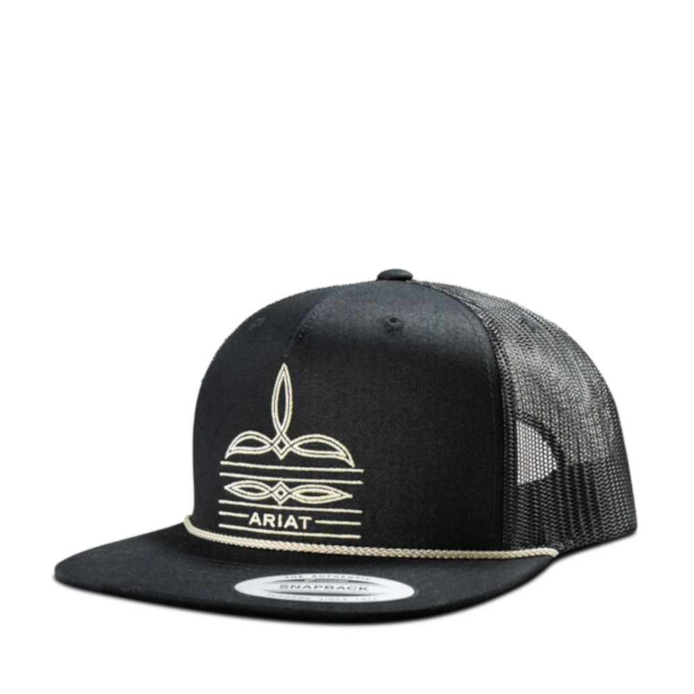 Gorra de hombre Ariat. Paneles frontales y visera negros con bordado de Ariat y un patrón de costura de bota/puntera y una cuerda en la visera. Parte trasera de malla negra con cierre ajustable (tipo snapback) para un ajuste perfecto.
