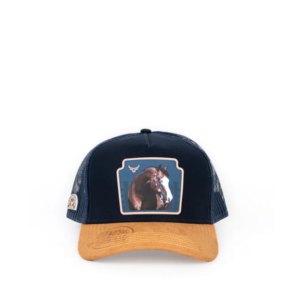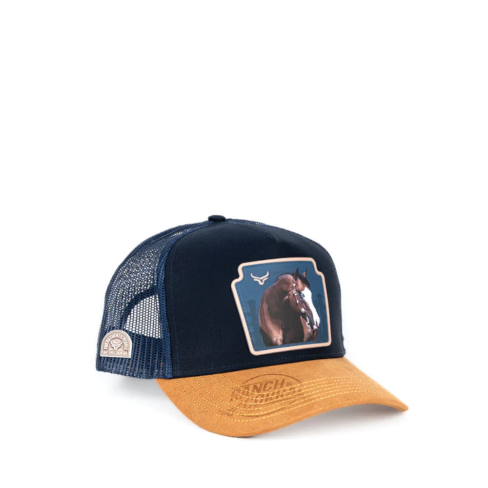 Gorra Ranch & Corral Equus 54 en color azul marino y visera naranja.