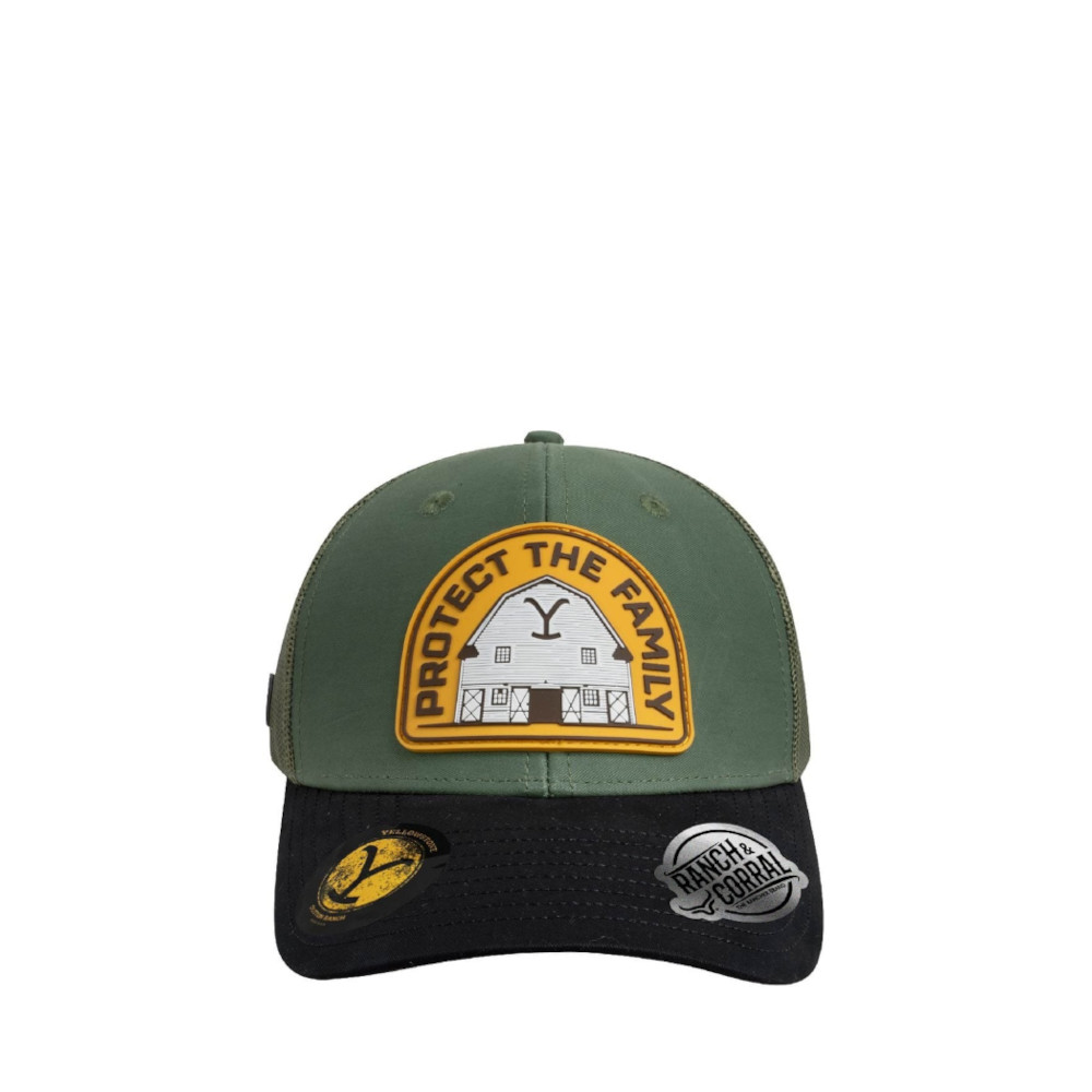 Gorra Ranch & Corral Yellowstone 28 en color verde y visera negra.