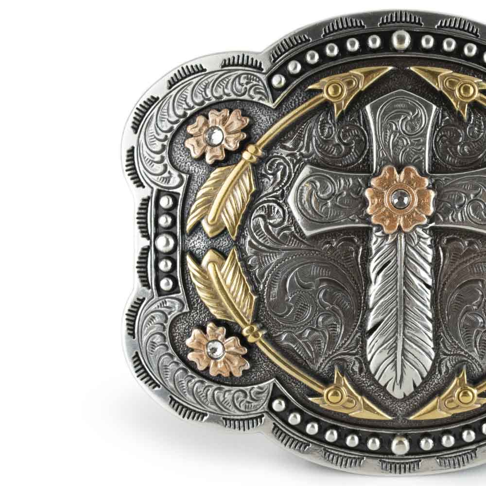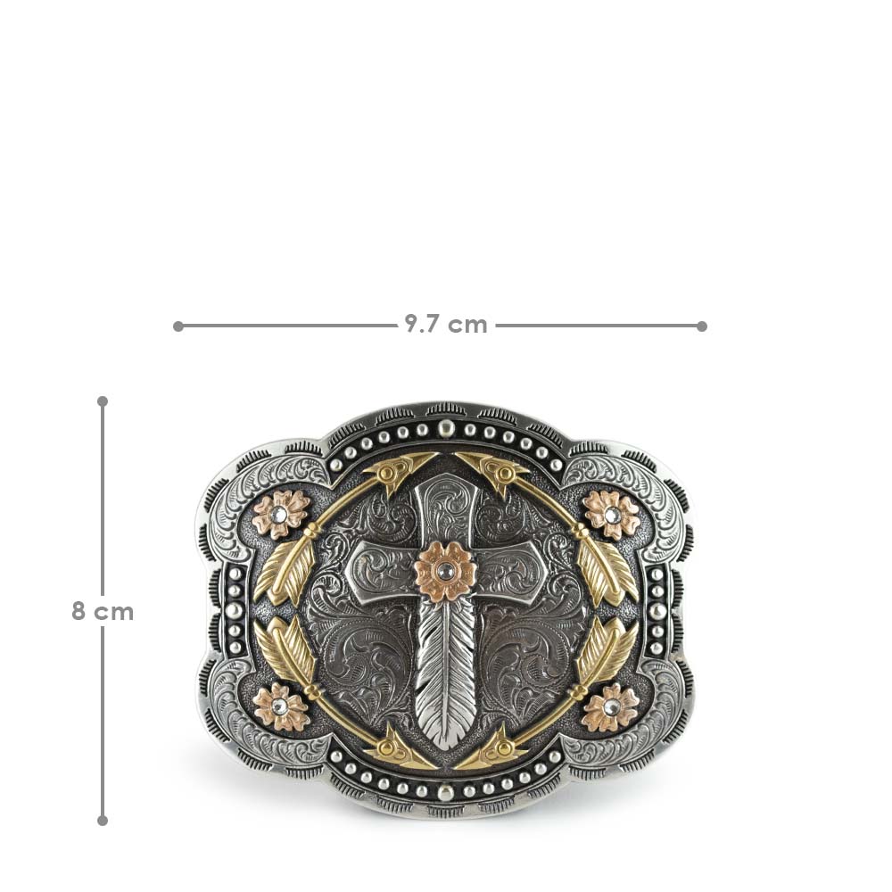 Hebilla con diseño de cruz, plumas y flecha en la parte central.