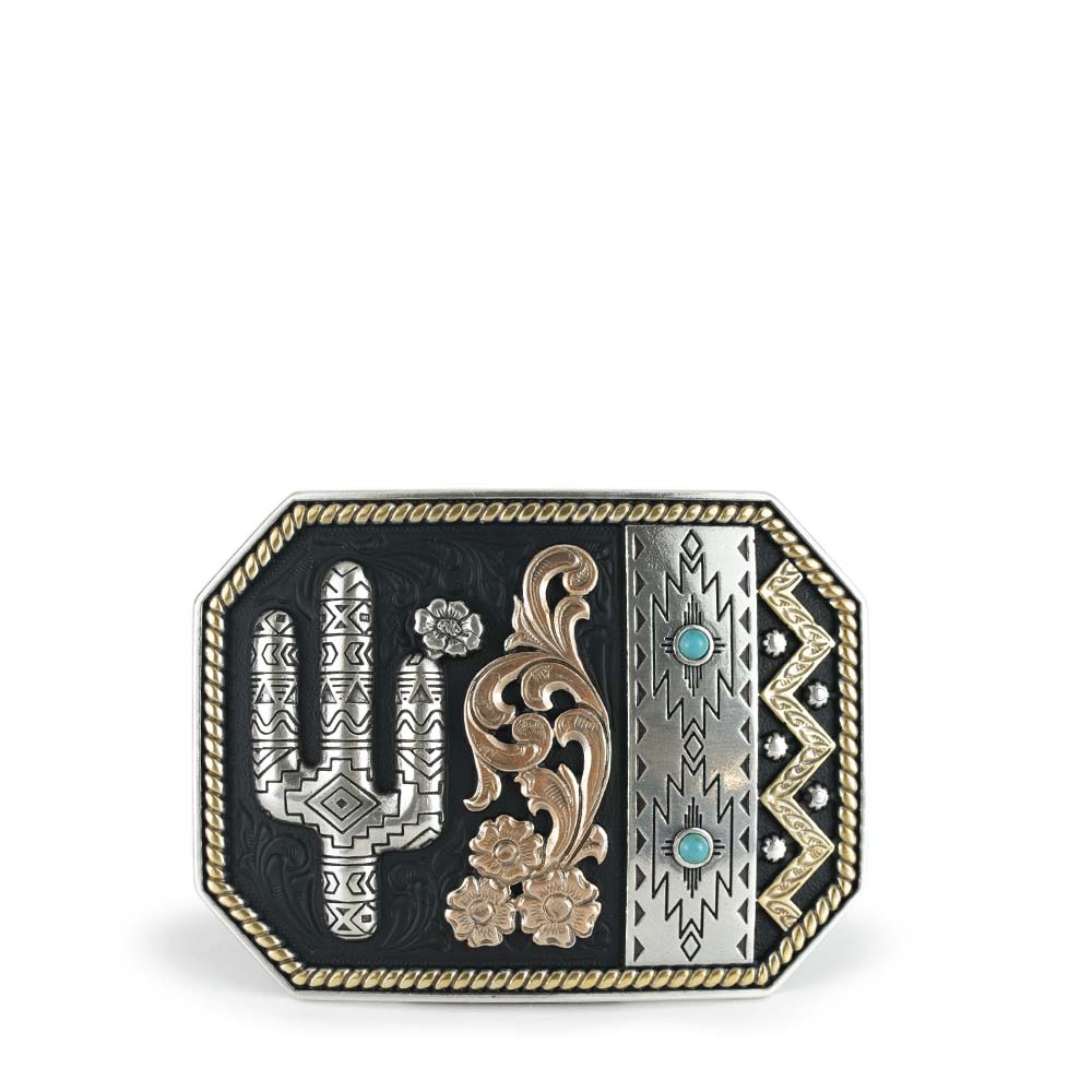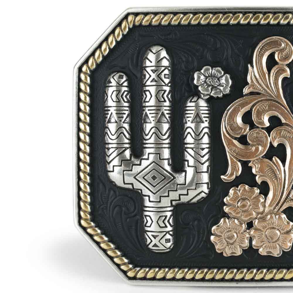 Hebilla de acero con diseño navajo de cactus y guias florales.