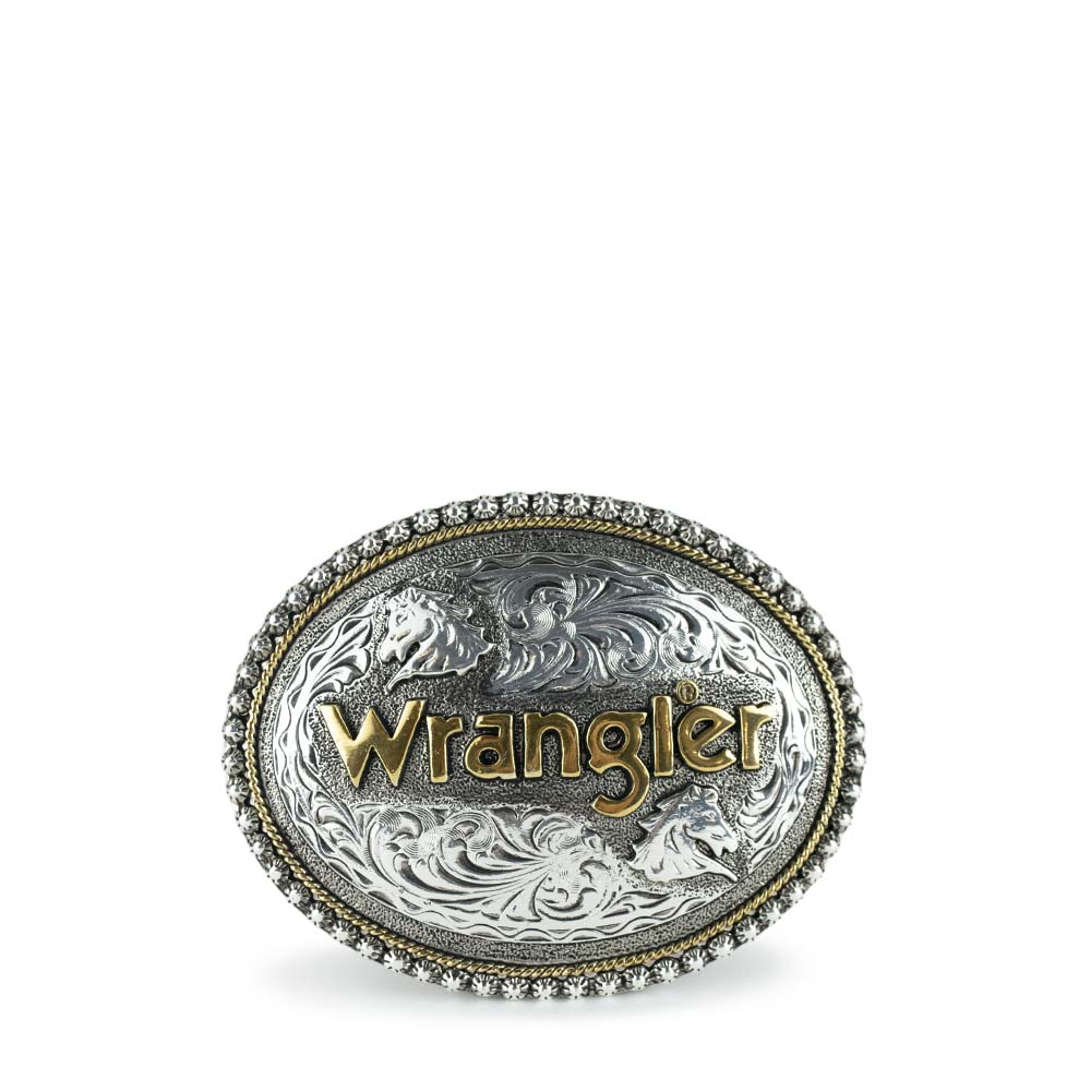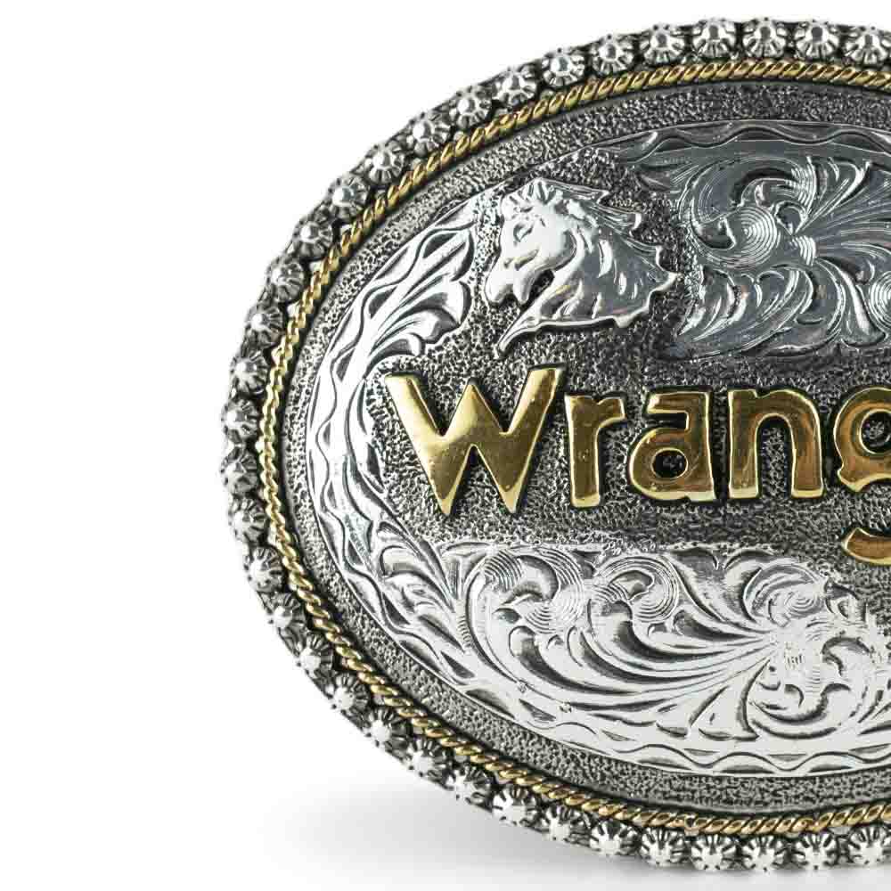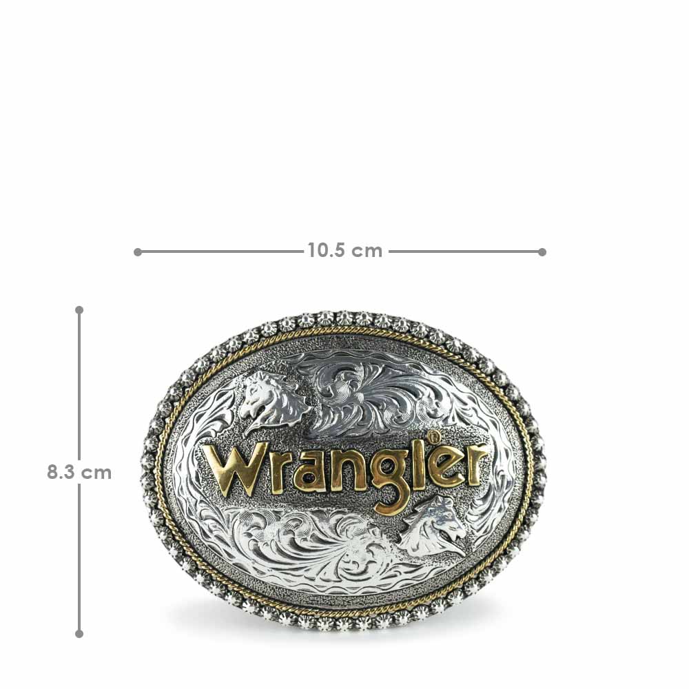 Hebilla ovalada Wrangler con diseños de caballo y guia floral.
