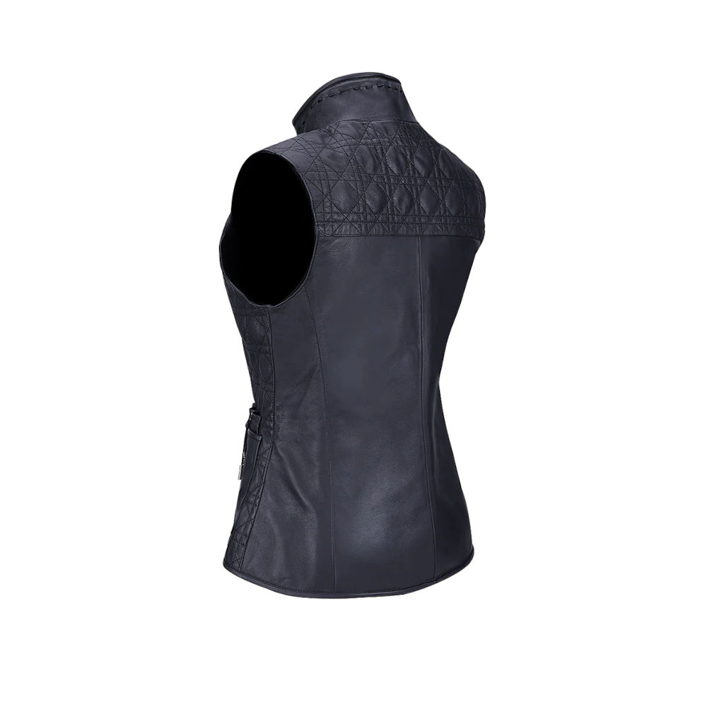 Chaleco para dama en piel genuina de ovino. Cuenta con dos bolsillos laterales, en los cuales se encuentran dos bolsillos más pequeños ajustados con elástico. Aplicación metálica de logotipo Cuadra. Ajuste frontal por medio de cierre