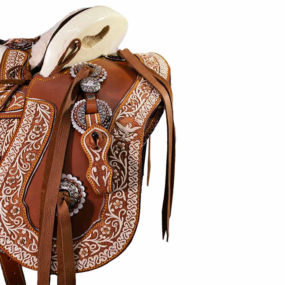 Montura en piel burgandi, cola de pato con cantinas y ribetes bordados en pita fina, asiento de borrega, cuenta con todo el herraje en acero inoxidable pavonado y fuste de bolsa de toro.