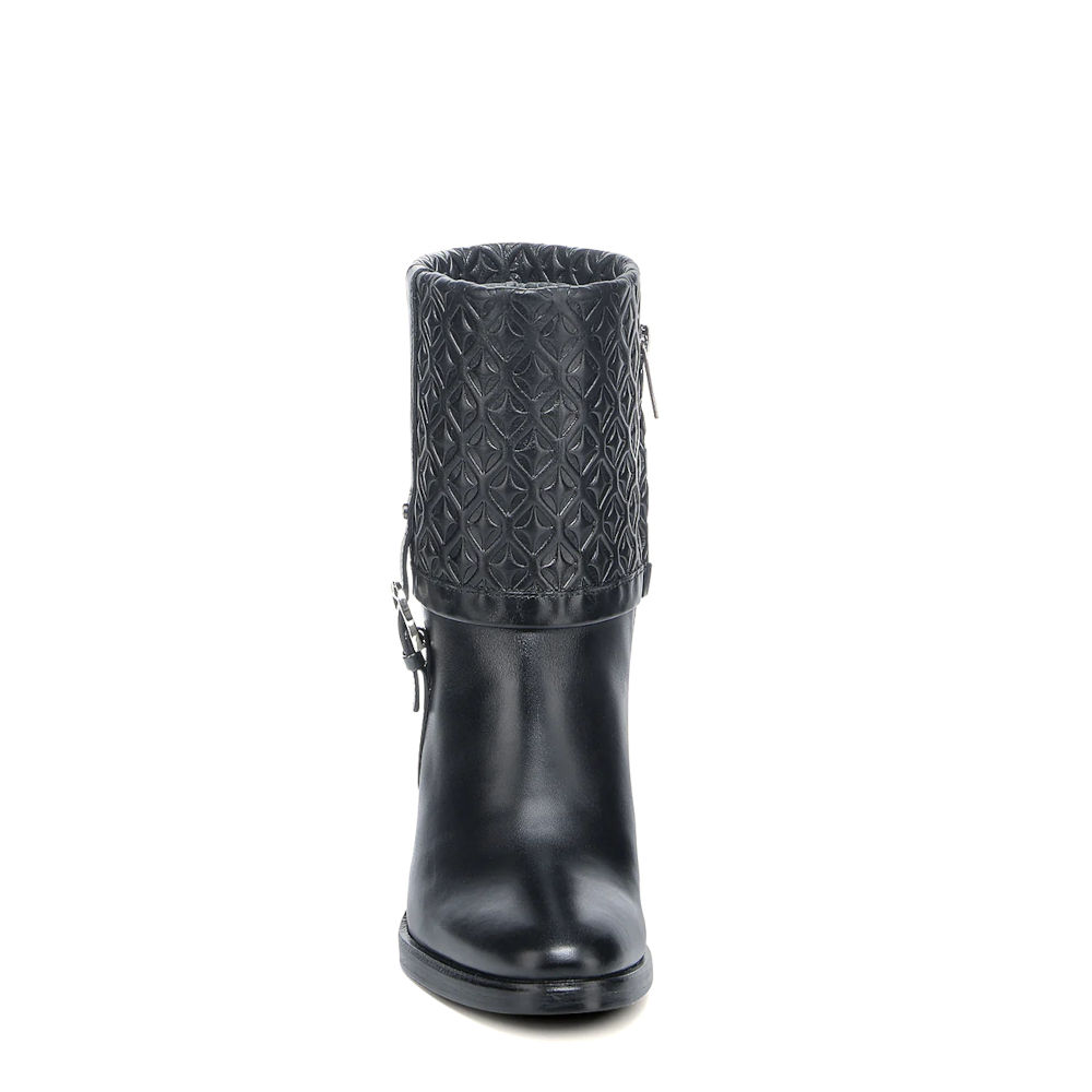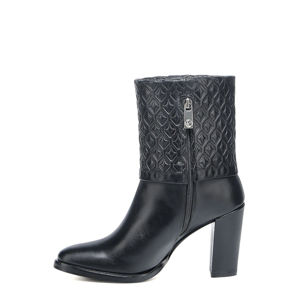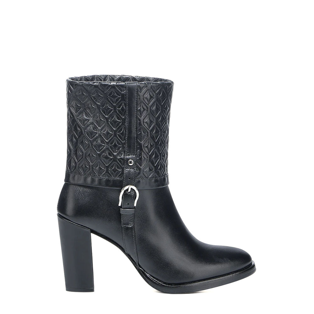 Botín de vestir para dama en piel genuina de bovino. Presenta diseño plegable con grabado en alto relieve en motivos geométricos, sombreado a mano y correa decorativa ajustada con hebilla. Ajustado con cierre interno. Suela de cuero de doble densidad con injerto de TPU.