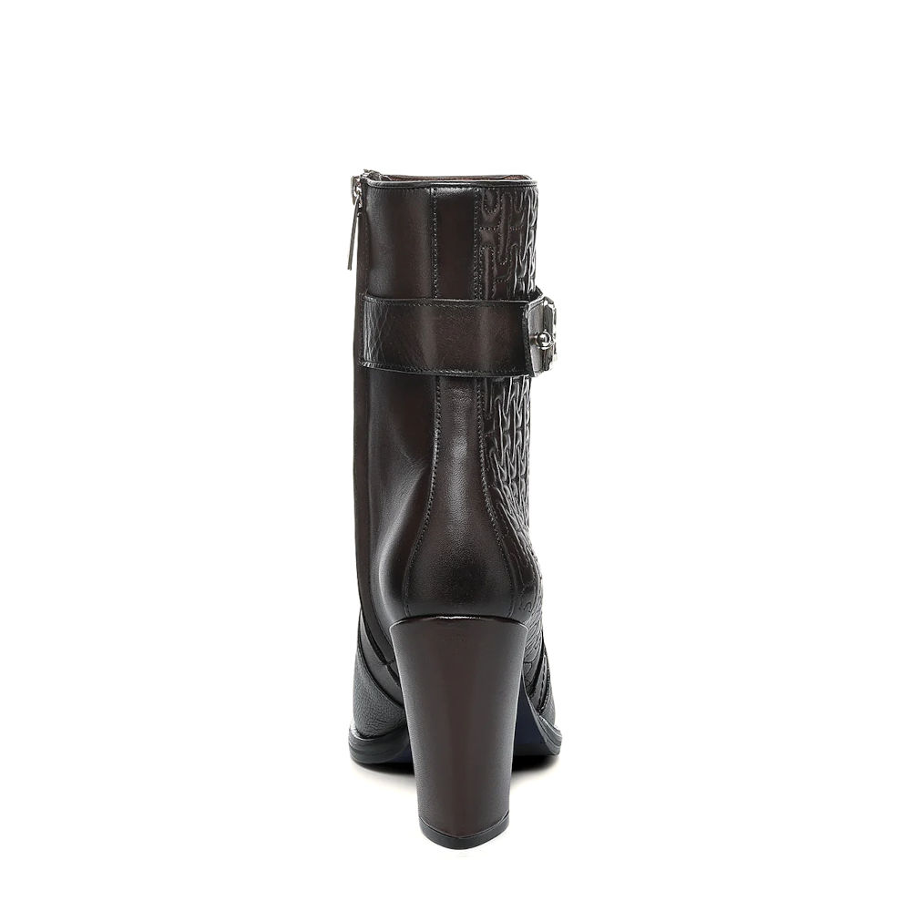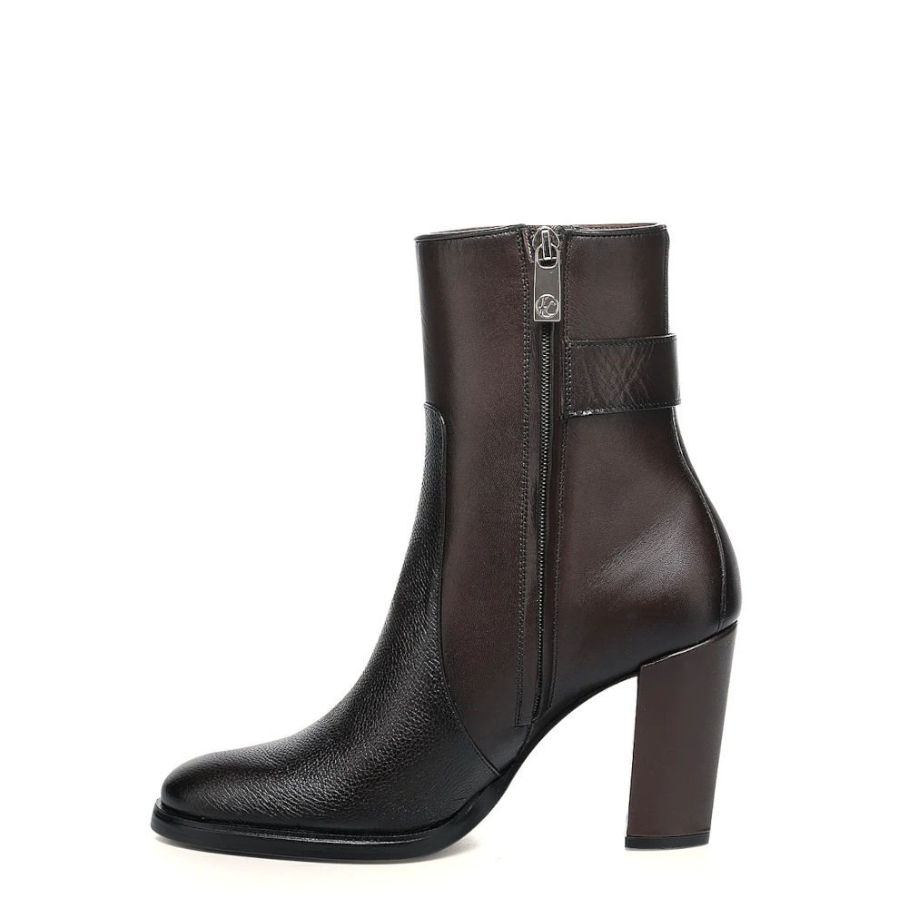 Botín de vestir para dama en piel genuina de ternera. Presenta capitonado en la parte trasera y una correa decorativa alrededor del tobillo sujeta con herraje del monograma FC. Ajustado con cierre interno. Suela de cuero con injerto de TPU.