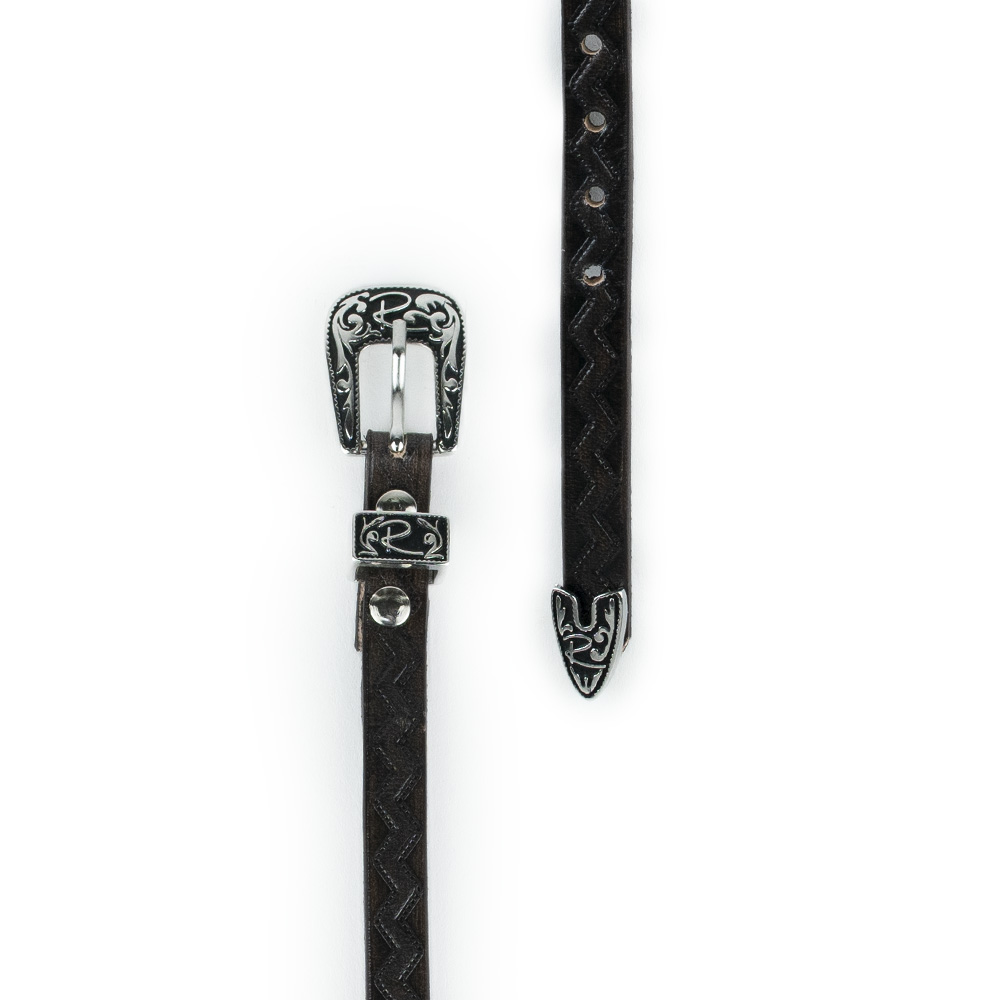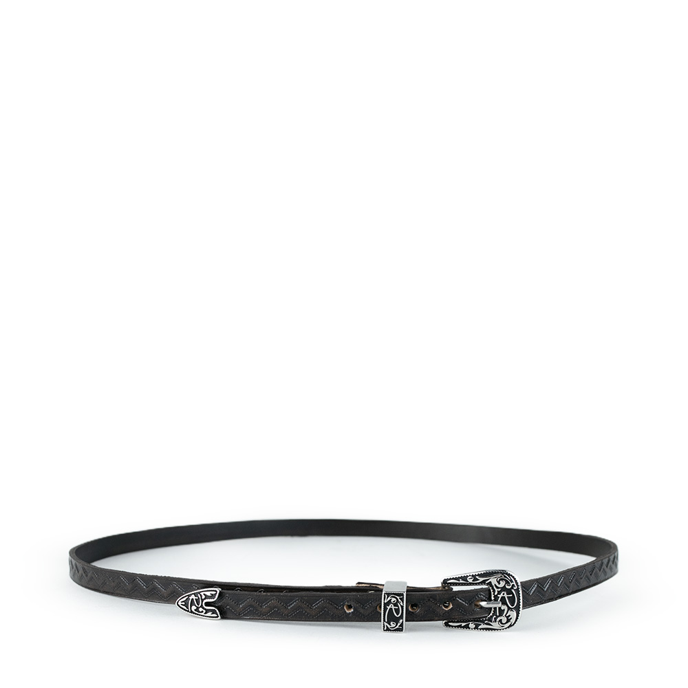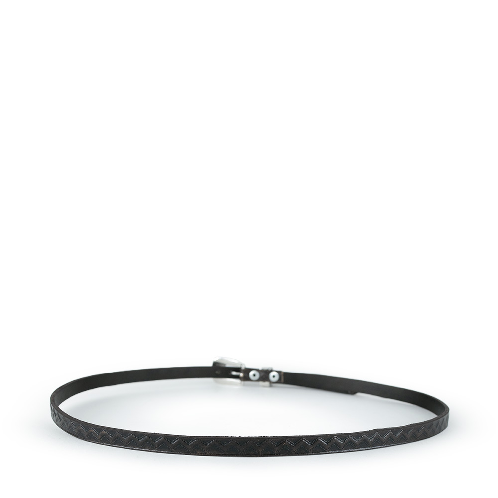 Toquilla con diseño grabado en patrón zig-zag a lo largo de toda la correa, añadiendo una textura y con detalles tradicionales en metal envejecido.