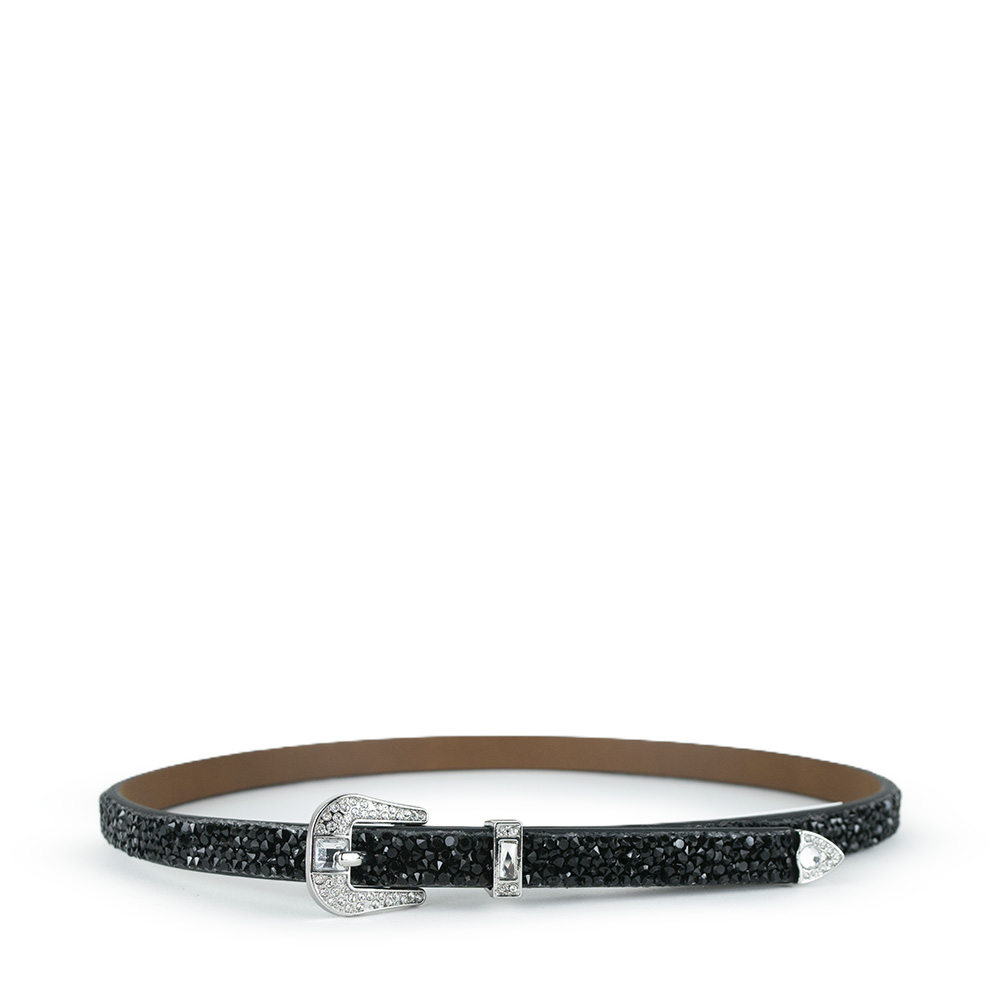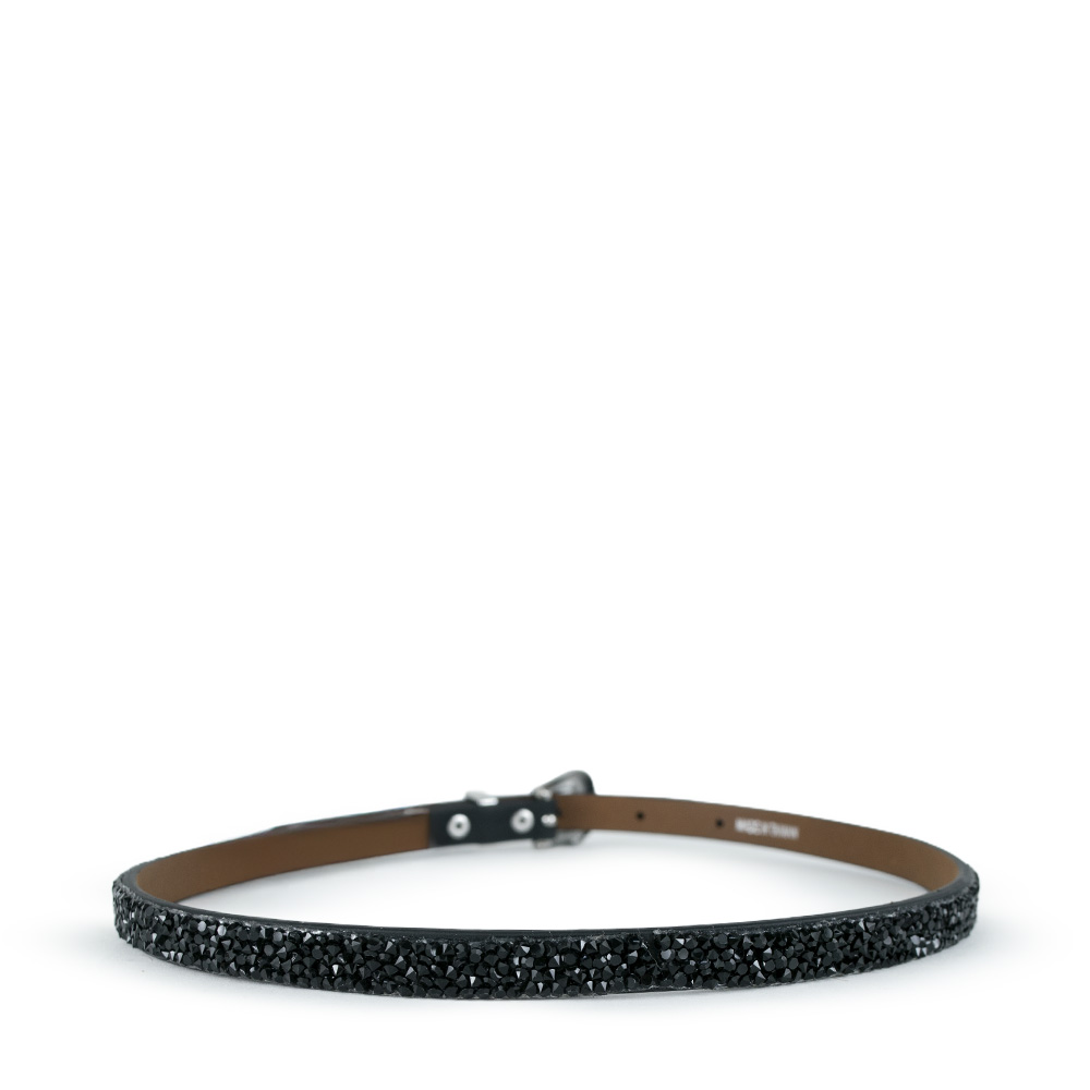 Toquilla adornada con pequeñas piedras negras brillantes. Cuenta con una hebilla con múltiples detalles añadiendo un contraste espectacular y un brillo inigualable.