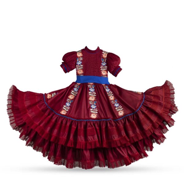 Vestido de Escaramuza Adelita cuenta con un olan que brinda movimiento y porte, bordado doble que destaca por su detalle artesanal, y pechera con alforzas que aporta un toque clásico y refinado. Incluye moño a juego para completar el conjunto. Ideal para presentaciones, competencias y eventos tradicionales.