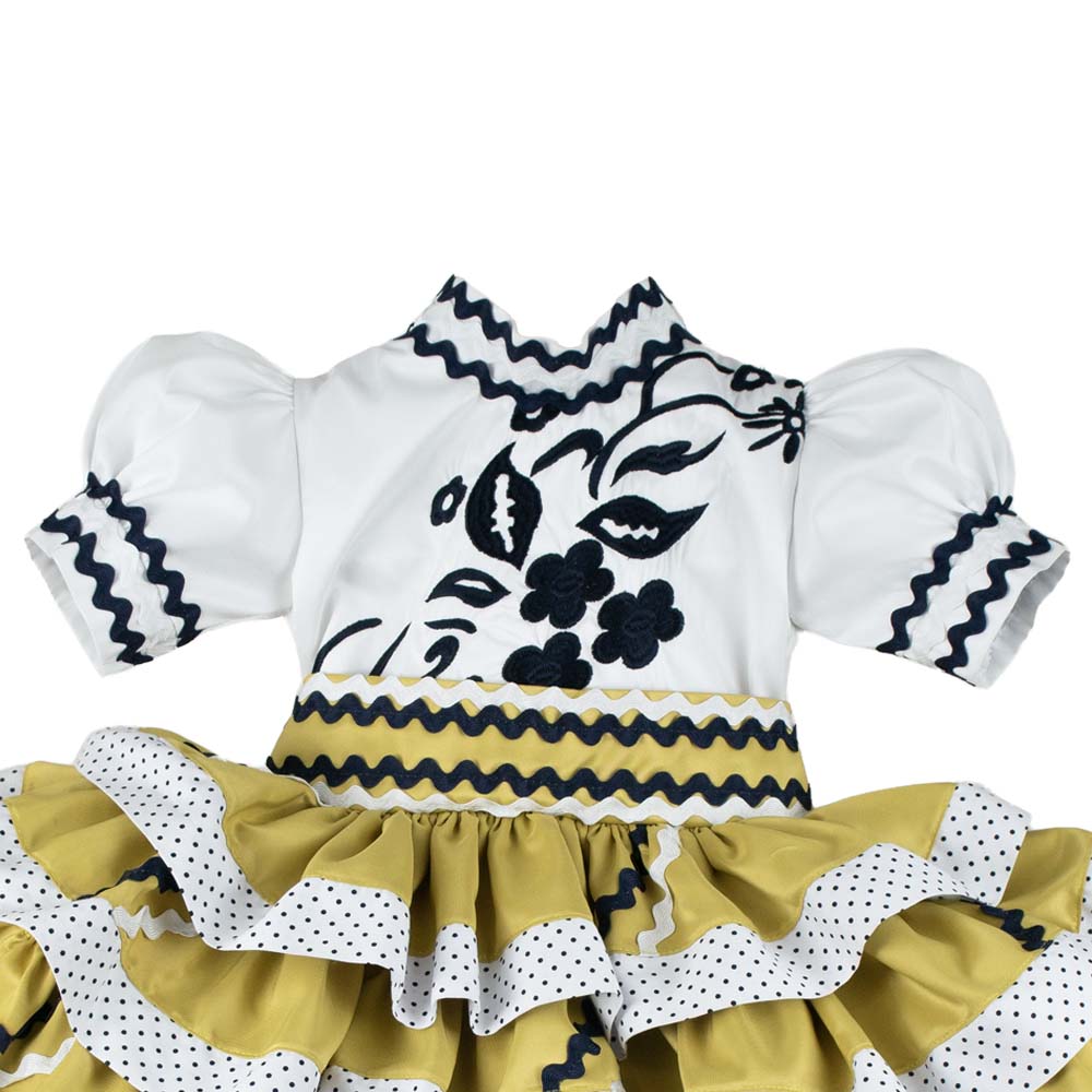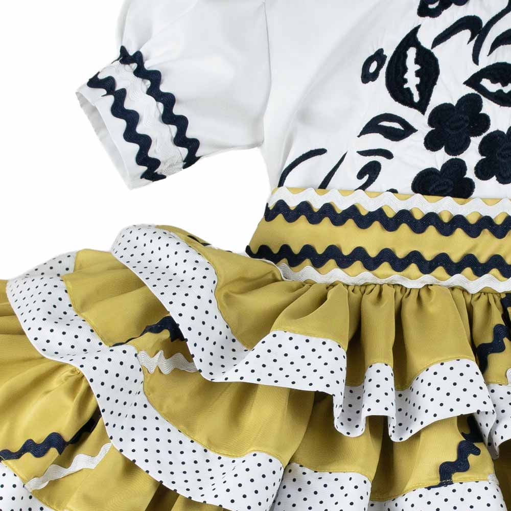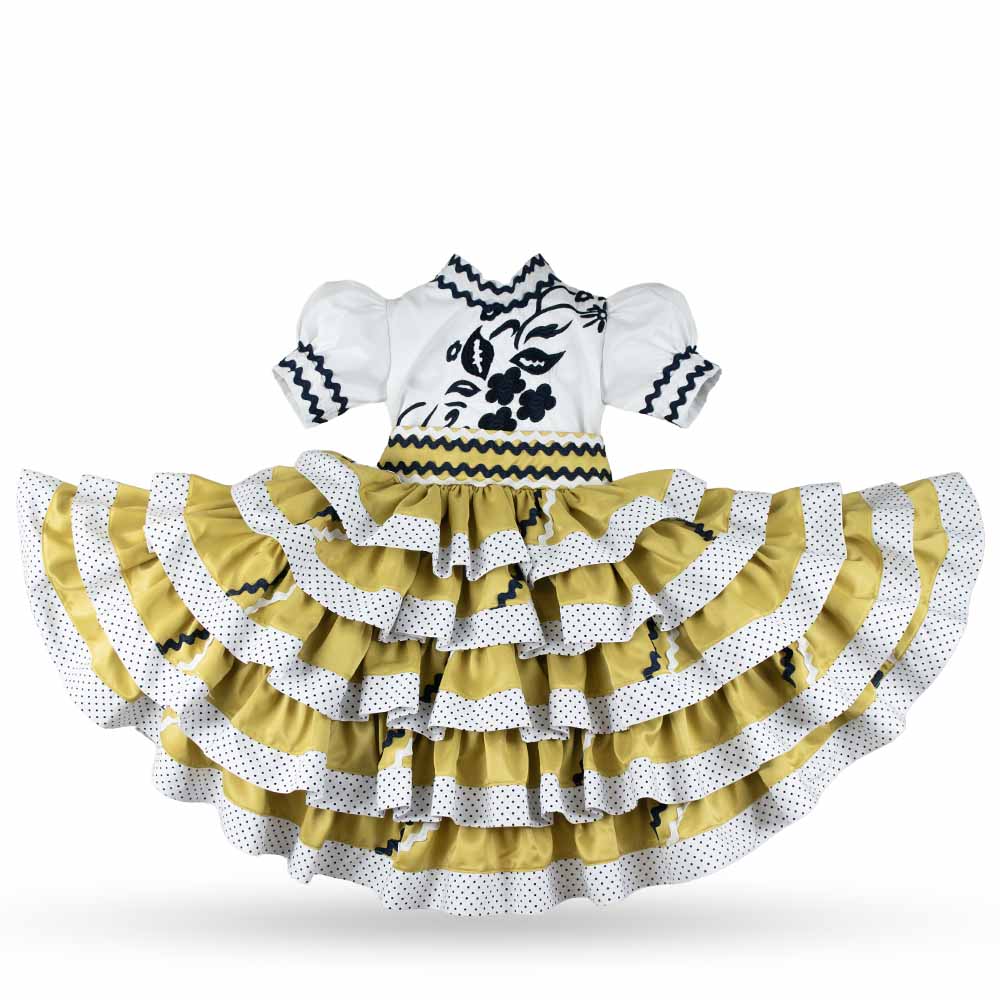 Vestido de Escaramuza Adelita en color Amarillo cuenta con 5 olanes en bordados color negro.